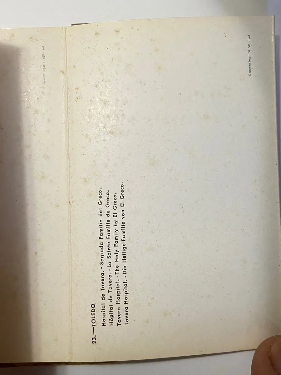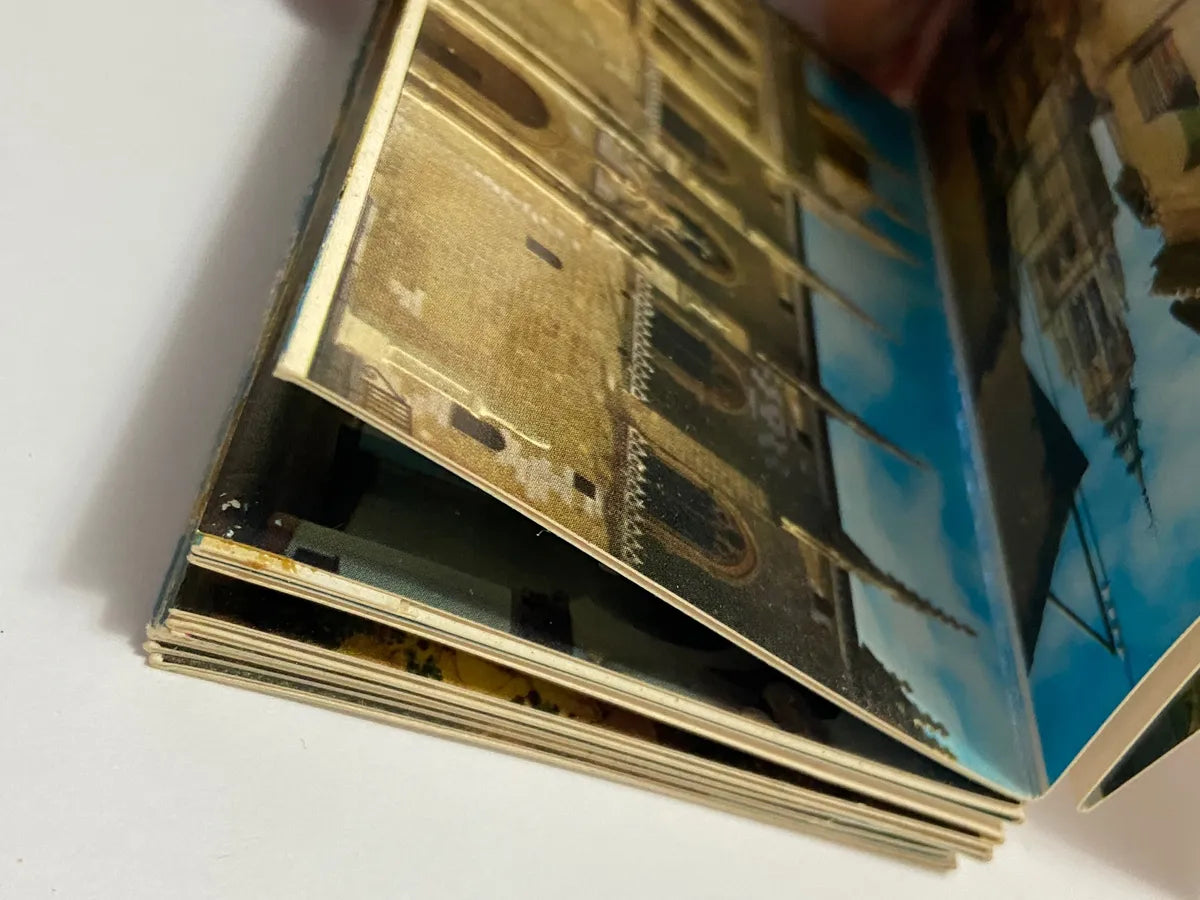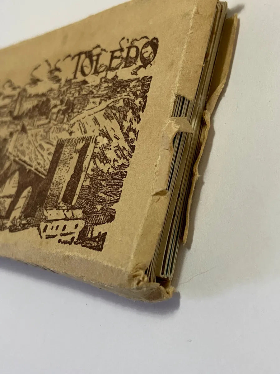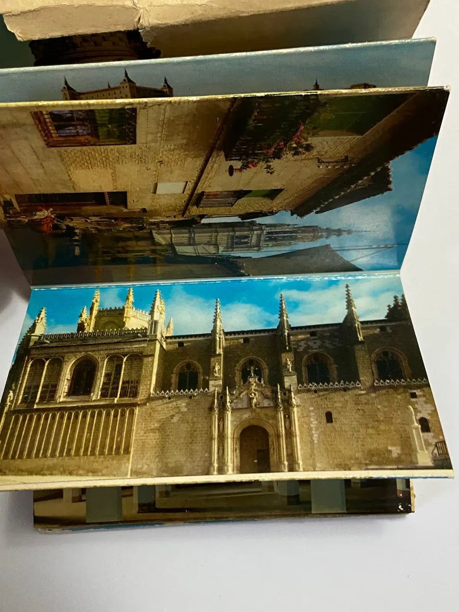 Cartela original de cartões postais com 24 vistas coloridas da cidade de Toledo, na Espanha. As imagens estão impressas em fotocolor, com belos registros de monumentos históricos como a Catedral de Toledo e o Alcázar. A embalagem é original da época, em papel ilustrado com desenho antigo da cidade e indicação “24 vistas en Fotocolor”.