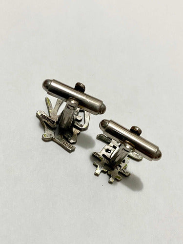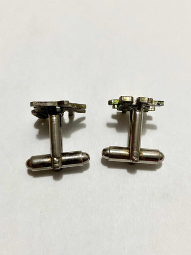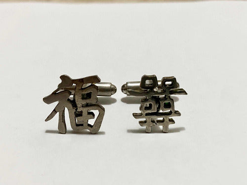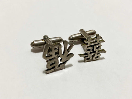 Par de abotoaduras antigas em prata, com design representando ideogramas chineses, com significado ligado à prosperidade e felicidade.