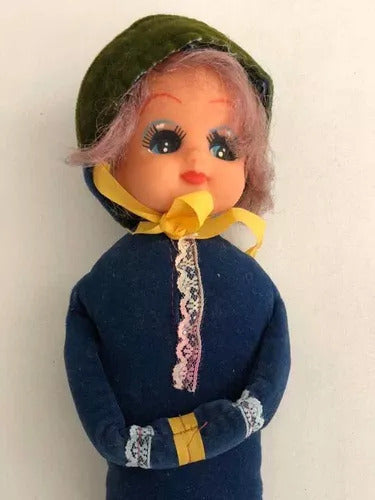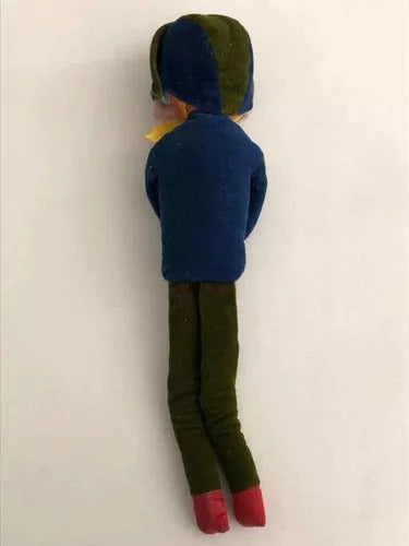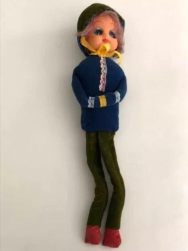 Boneca antiga confeccionada com corpo em pano e roupas em camurça, típica das décadas de 60 ou 70. Possui cabeça de plástico com traços marcantes, olhos grandes, cílios longos e cabelo sintético. Veste gorro, blusa azul com detalhes em renda, calça verde e sapatos vermelhos