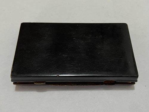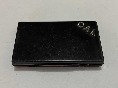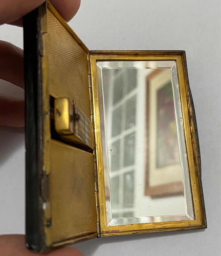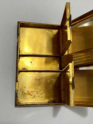 Raro estojo de maquiagem vintage com acabamento dourado e tampa com espelho interno. A peça possui compartimentos internos em metal texturizado e a sigla "CAL" na parte externa