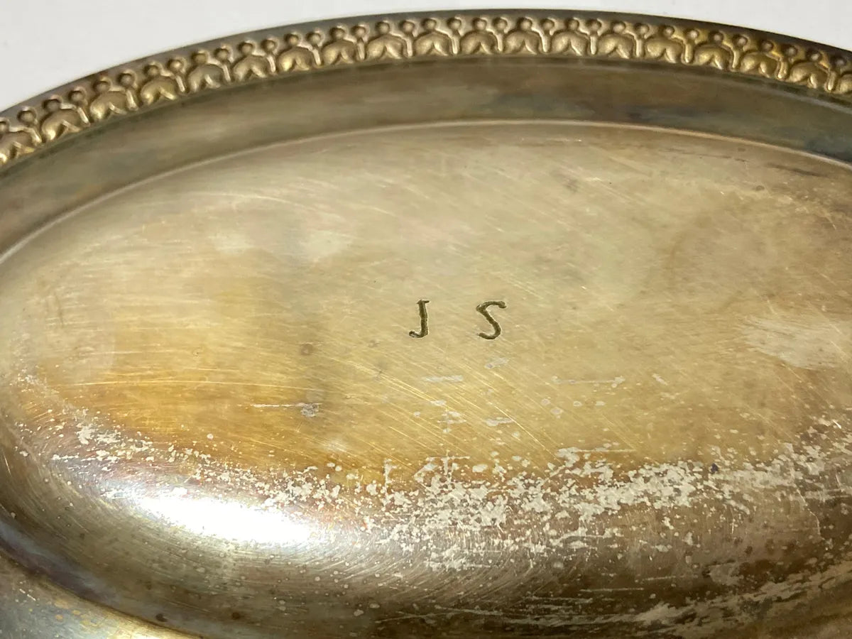 Elegante travessa antiga oval em metal prateado, medindo 27 x 18,5 cm. A peça apresenta delicada borda com detalhes em relevo, evidenciando o trabalho artesanal da época. Possui marcas do tempo e oxidação natural, que podem ser restauradas com polimento ou mantidas para valorizar sua pátina original.