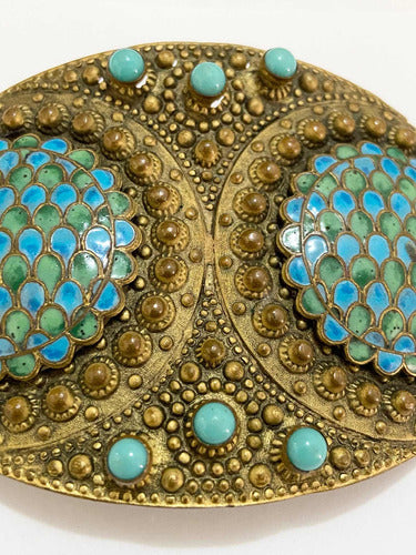 Fivela De Cinto Antiga com acabamento dourado e detalhado trabalho em relevo. Apresenta duas peças centrais em formato de escama esmaltadas em tons de azul e verde, cercadas por pequenas esferas e pedras turquesa.