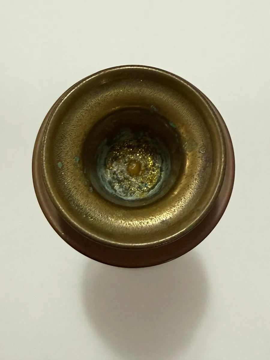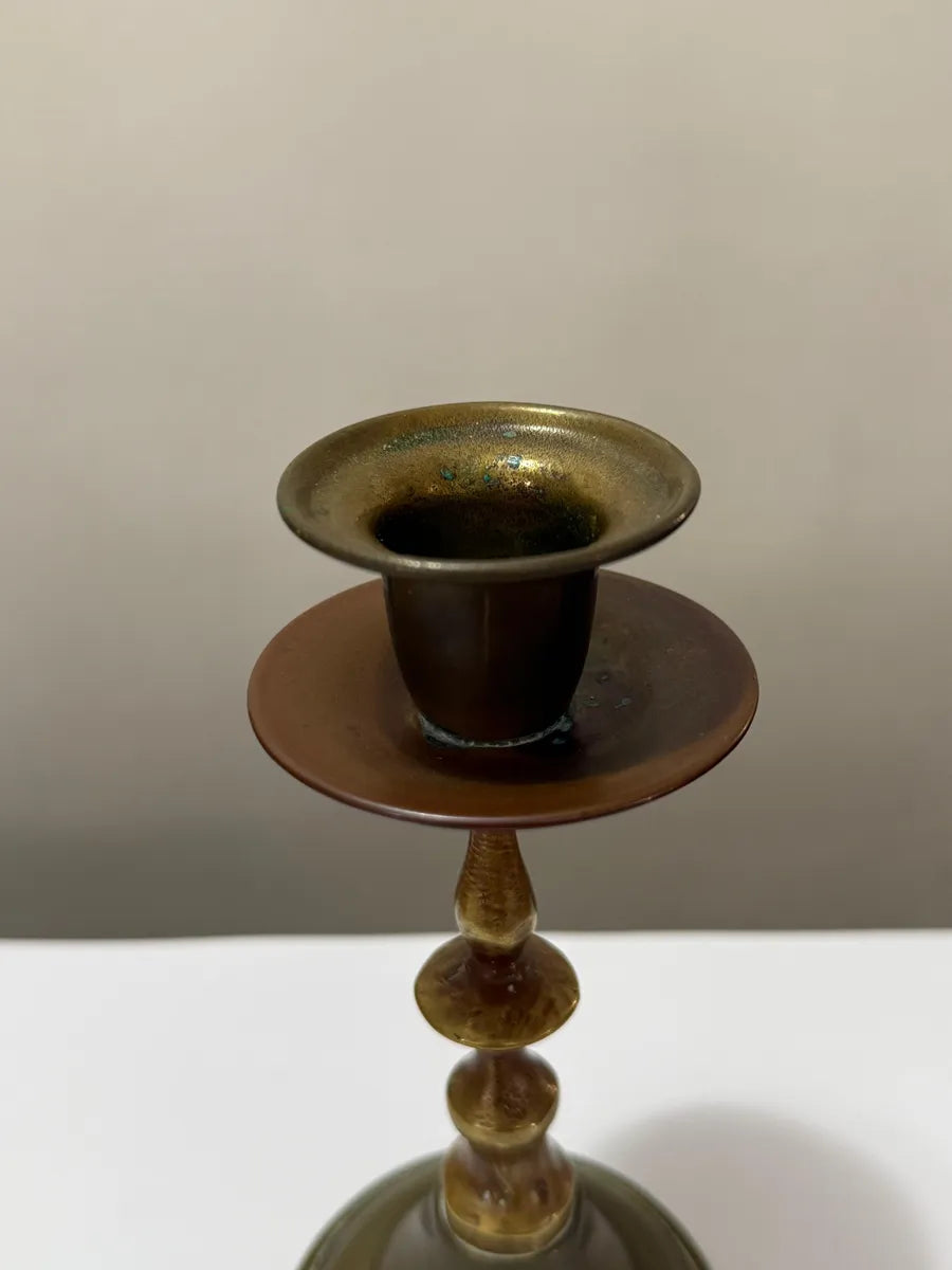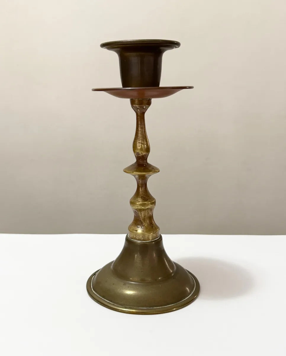 Castiçal antigo em bronze/latão, medindo 15,5 cm de altura. Design clássico inglês, final do século XIX ao início do século XX, com pátina original.