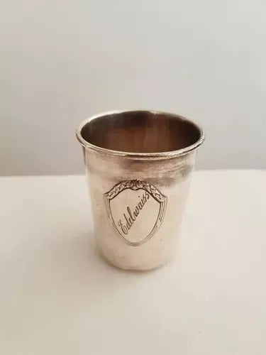 Raro copo antigo em prata da marca Wolff, personalizado com o brasão e o nome na frente e a inscrição “Lembrança Nestlé” na base.