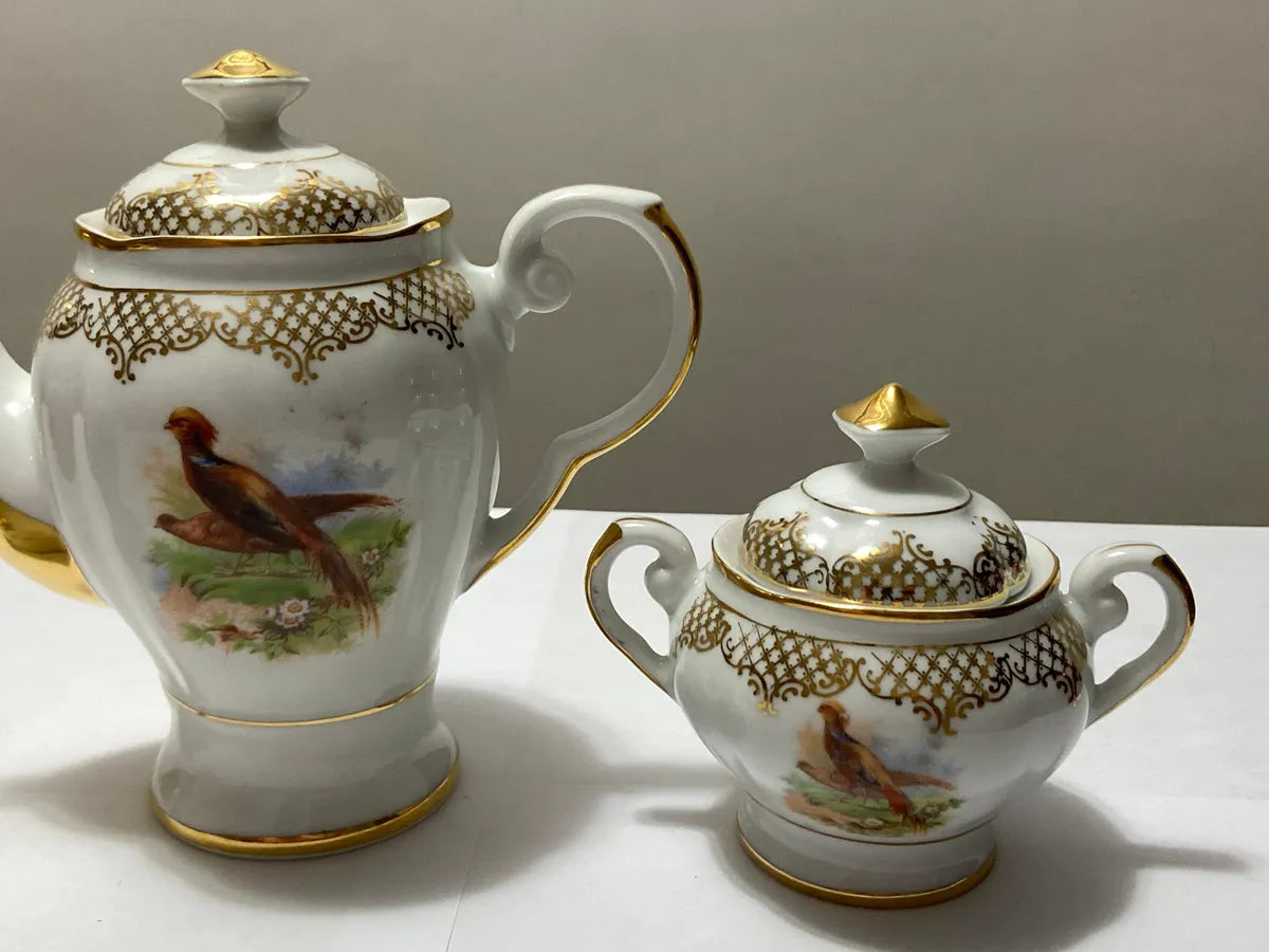 Conjunto antigo de porcelana brasileira Real (São Paulo), composto por bule (17 cm), açucareiro com tampa (11 cm) e leiteira (10,5 cm). As peças trazem delicada pintura de pássaros em paisagem campestre, com acabamento em dourado e bordas rendadas em estilo clássico.