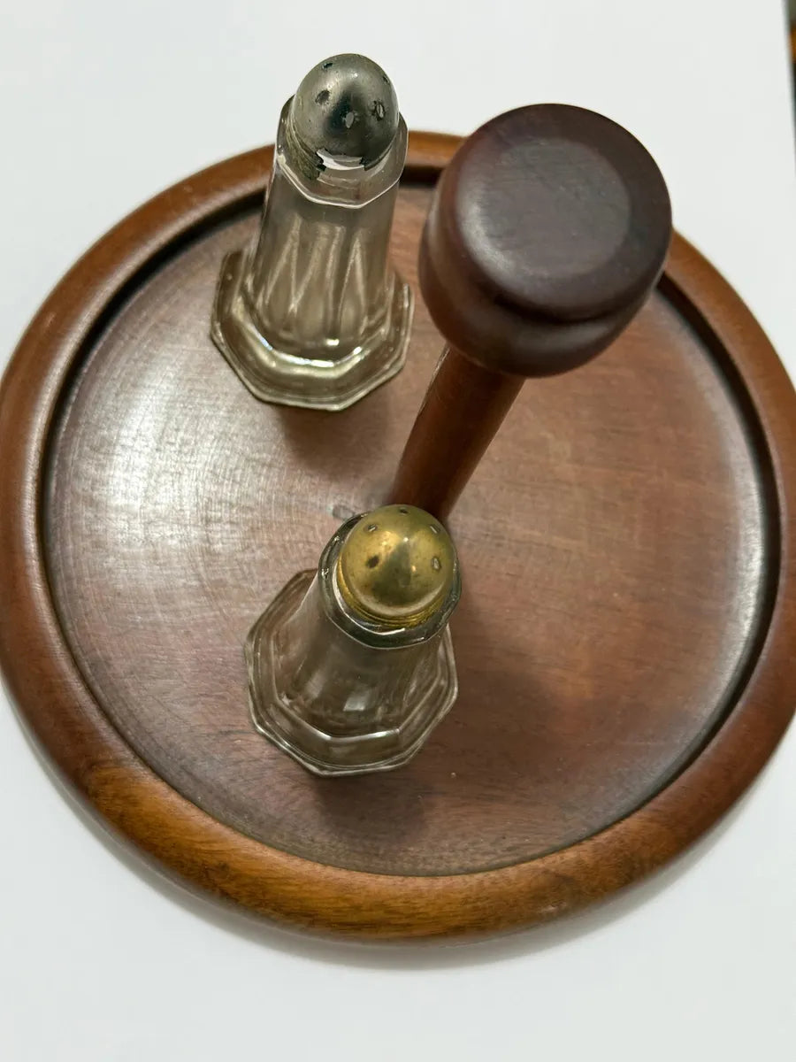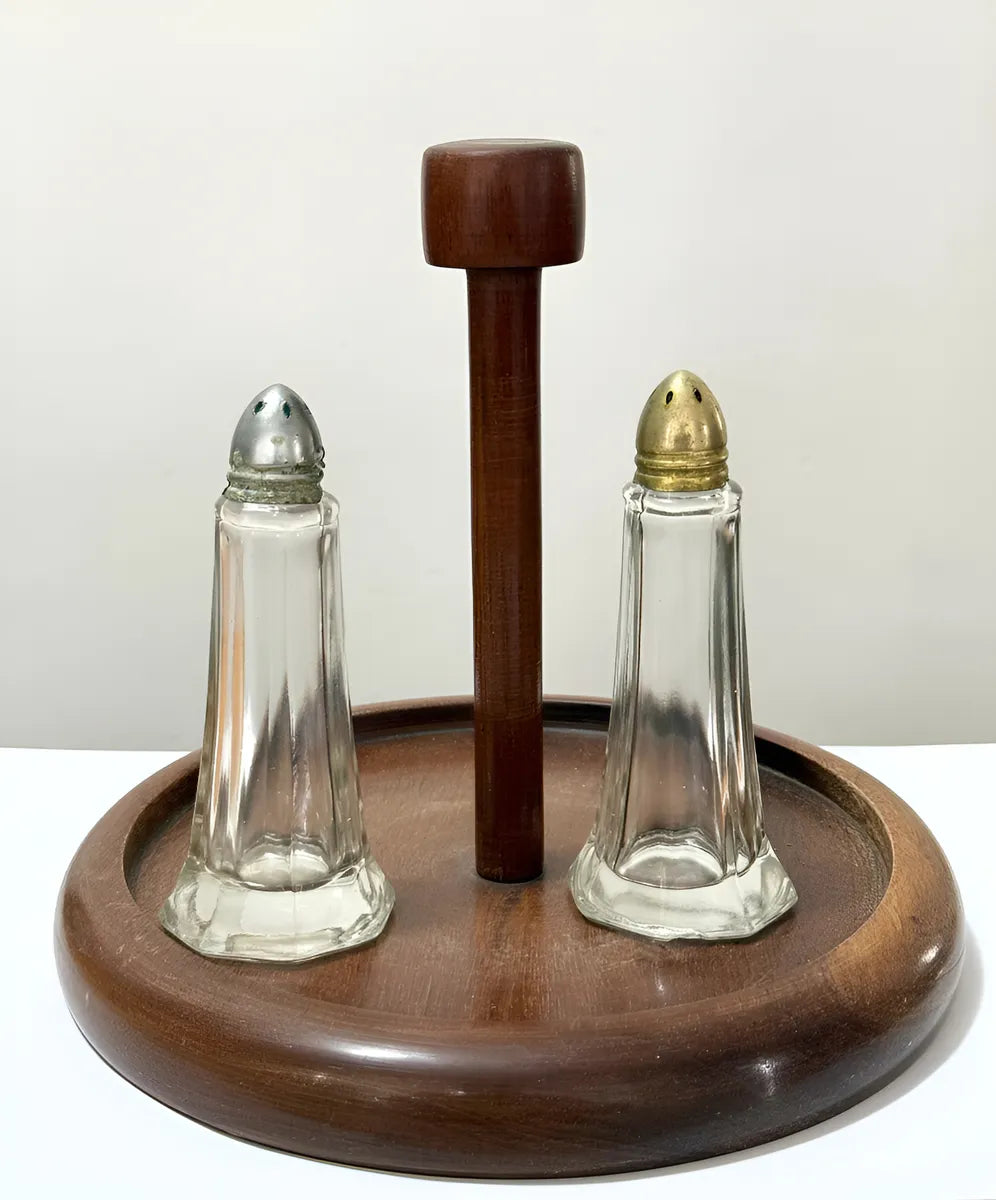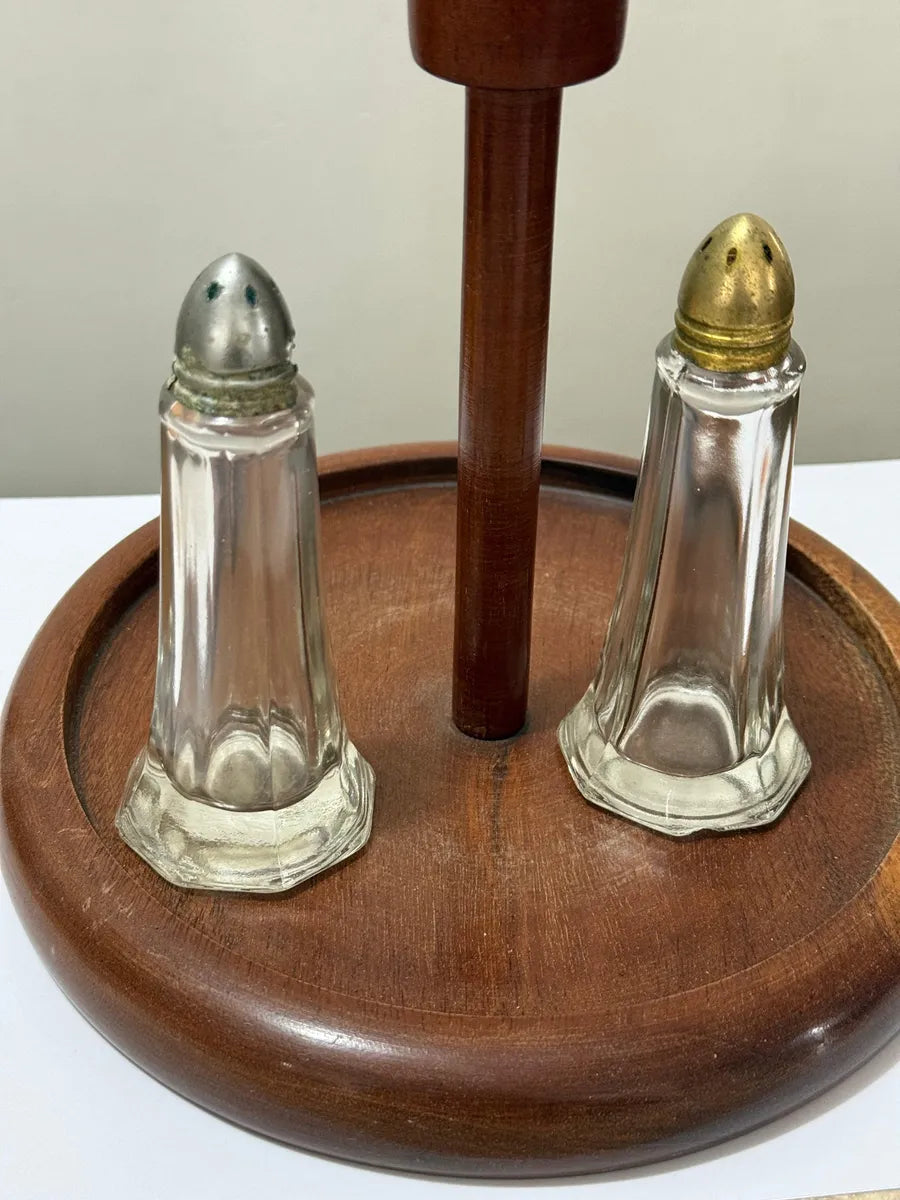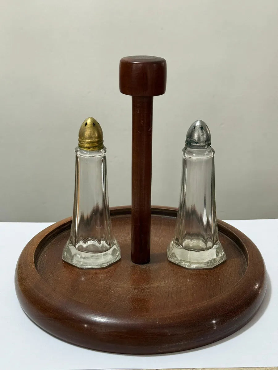 Porta temperos antigo confeccionado em madeira mogno, com duas peças em vidro transparente e tampas metálicas (uma em tom prateado e outra dourado). Estrutura firme, com acabamento torneado e base redonda de 19,5 cm de diâmetro, suporte central com 18 cm de altura. Os vidros medem 11,5 cm de altura e base de 5 cm cada.