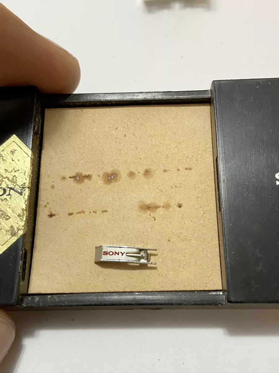 Cartucho de fonocaptador para toca-discos (também conhecido como agulha de toca-discos ou cápsula fonográfica). Especificamente, ele é um cartucho do tipo moving coil (bobina móvel), identificado pelo modelo VC-8E da Sony, que era comum em toca-discos de alta qualidade na época. O outro item é uma caixa de substituição de estilete (agulha) de reposição, modelo AG-110.