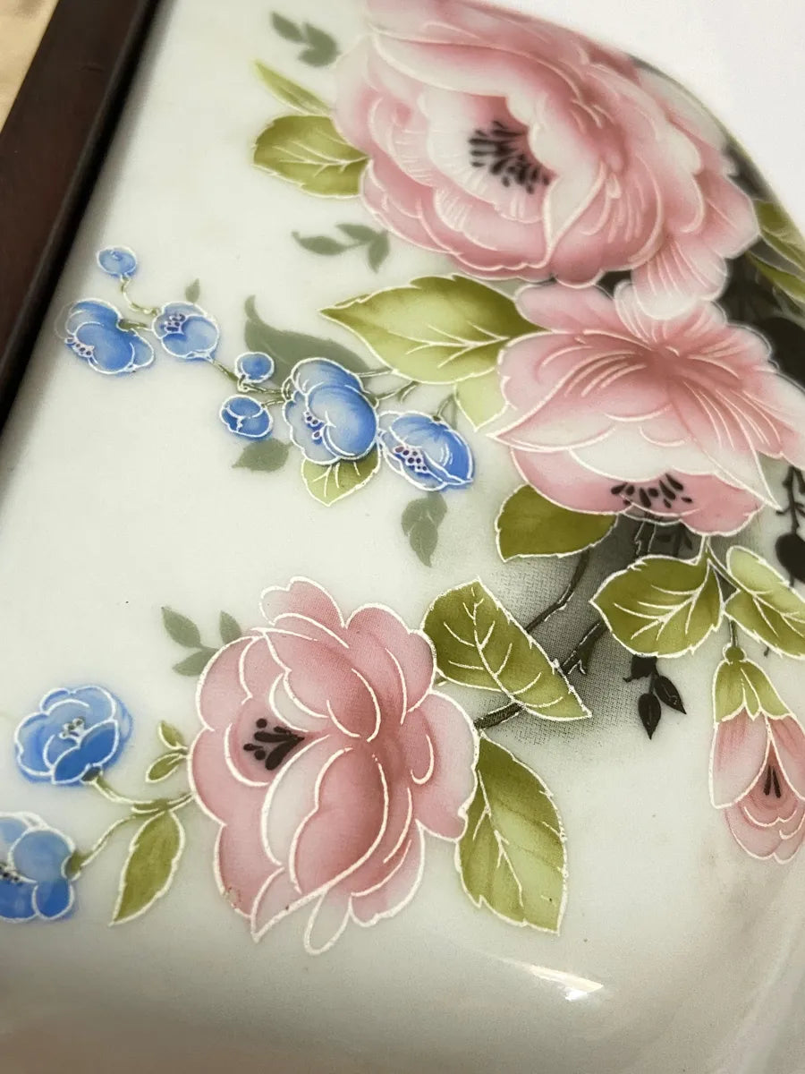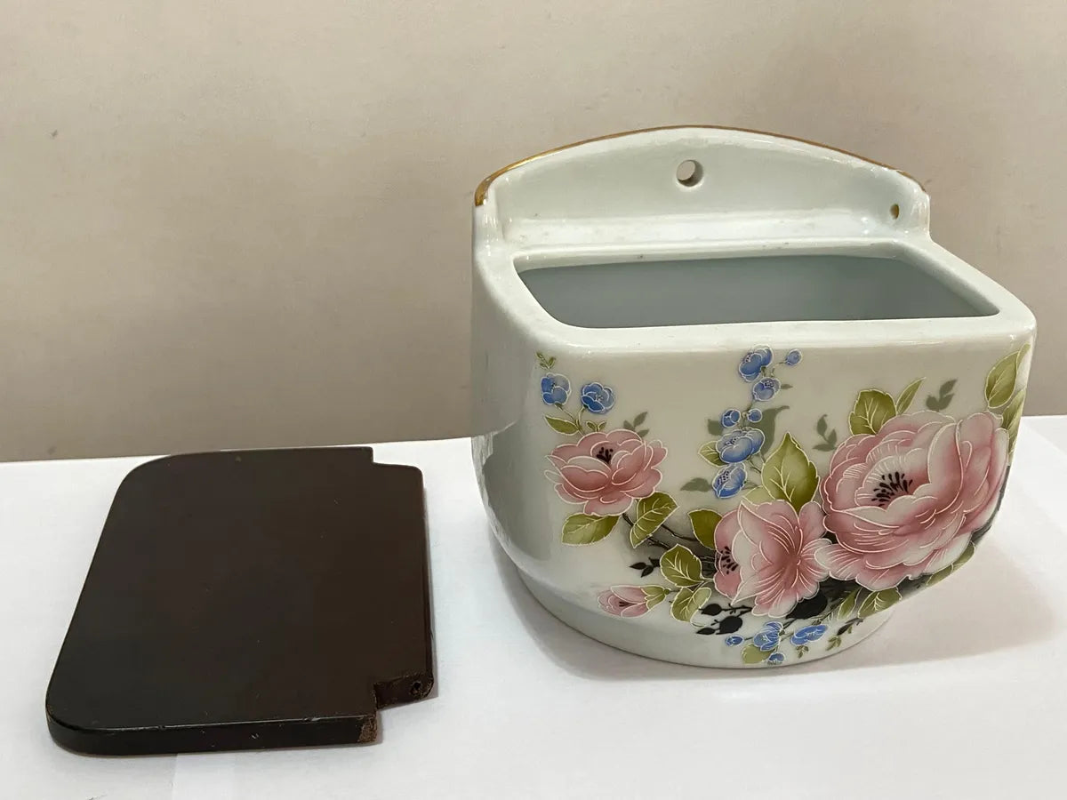Trata-se de um porta sal de parede em porcelana, com tampa de madeira e delicada decoração floral em tons de rosa, azul e verde.