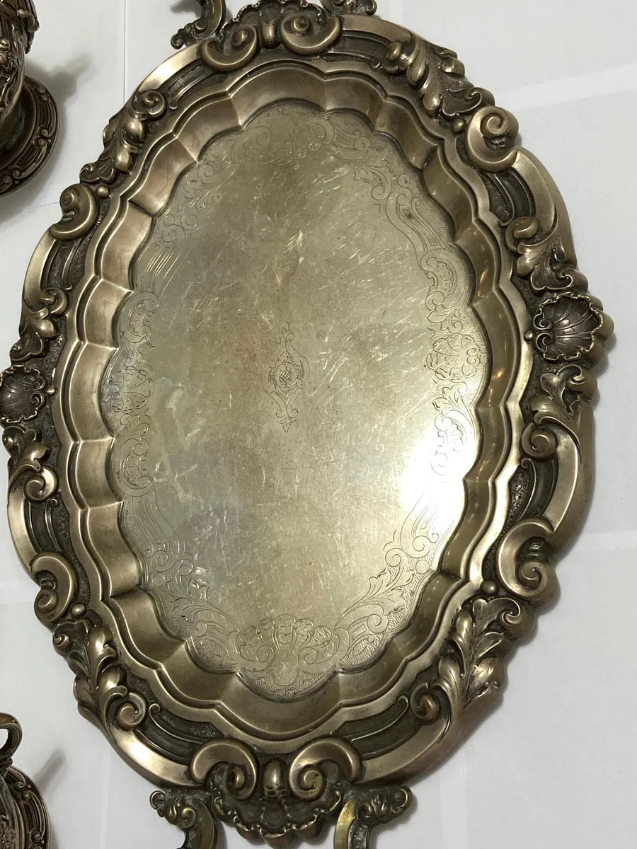 Peças ricamente cinzeladas, com concheados e volutas de grande refinamento artístico, evidenciando o trabalho manual de ourives portugueses da época.