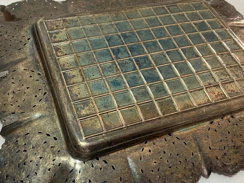 Bandeja Antiga De Metal Com Desenhos Retangular Cor Prata