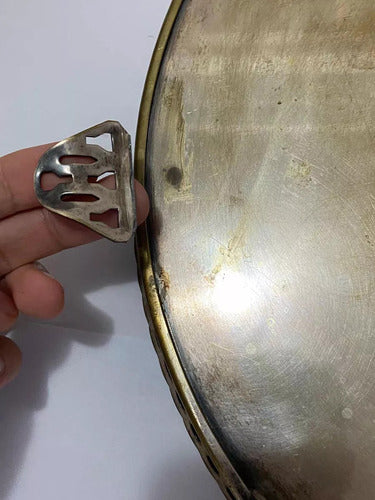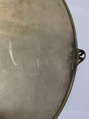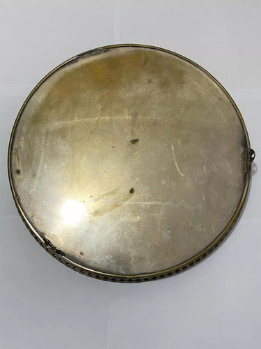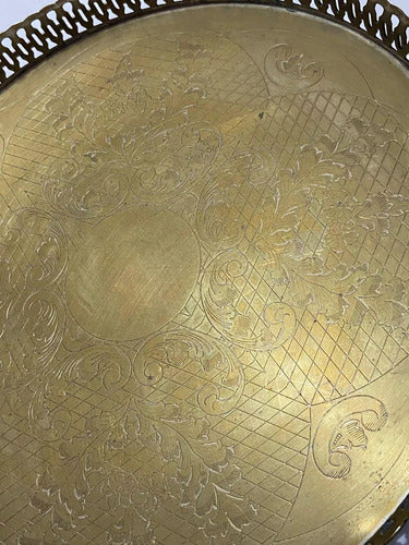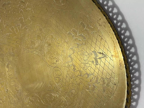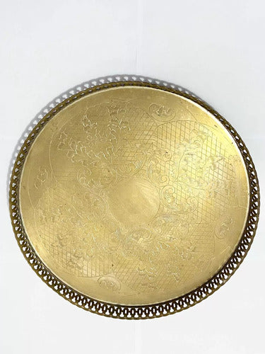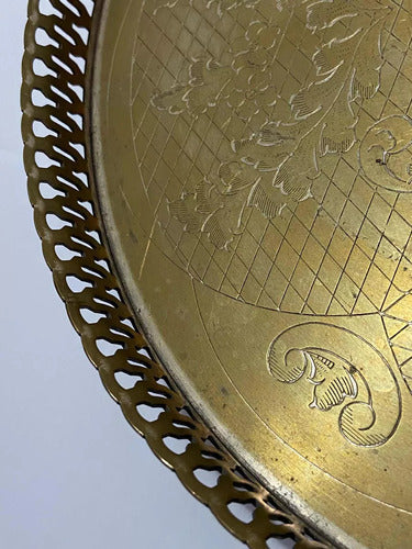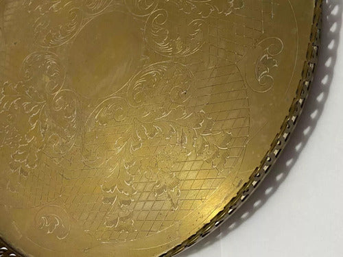 Bandeja antiga redonda em metal dourado, com belos desenhos florais gravados e borda vazada trabalhada. Possui 36cm de diâmetro.