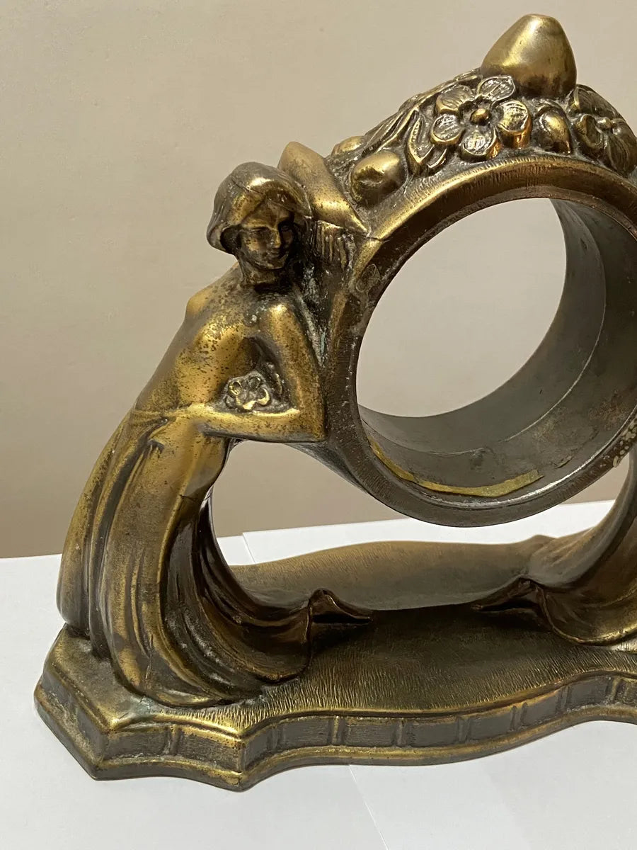 Peça antiga em metal com acabamento bronze antigo (possivelmente spelter), típico do estilo Art Nouveau.”