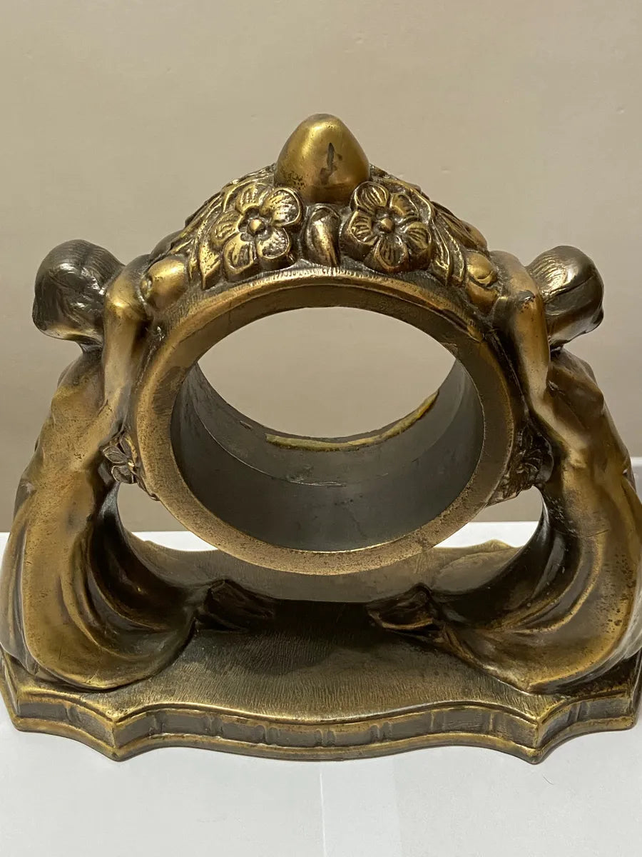 Base para relógio de mesa antigo no estilo Art Nouveau, com duas figuras femininas ladeando o aro central e detalhes florais no topo.