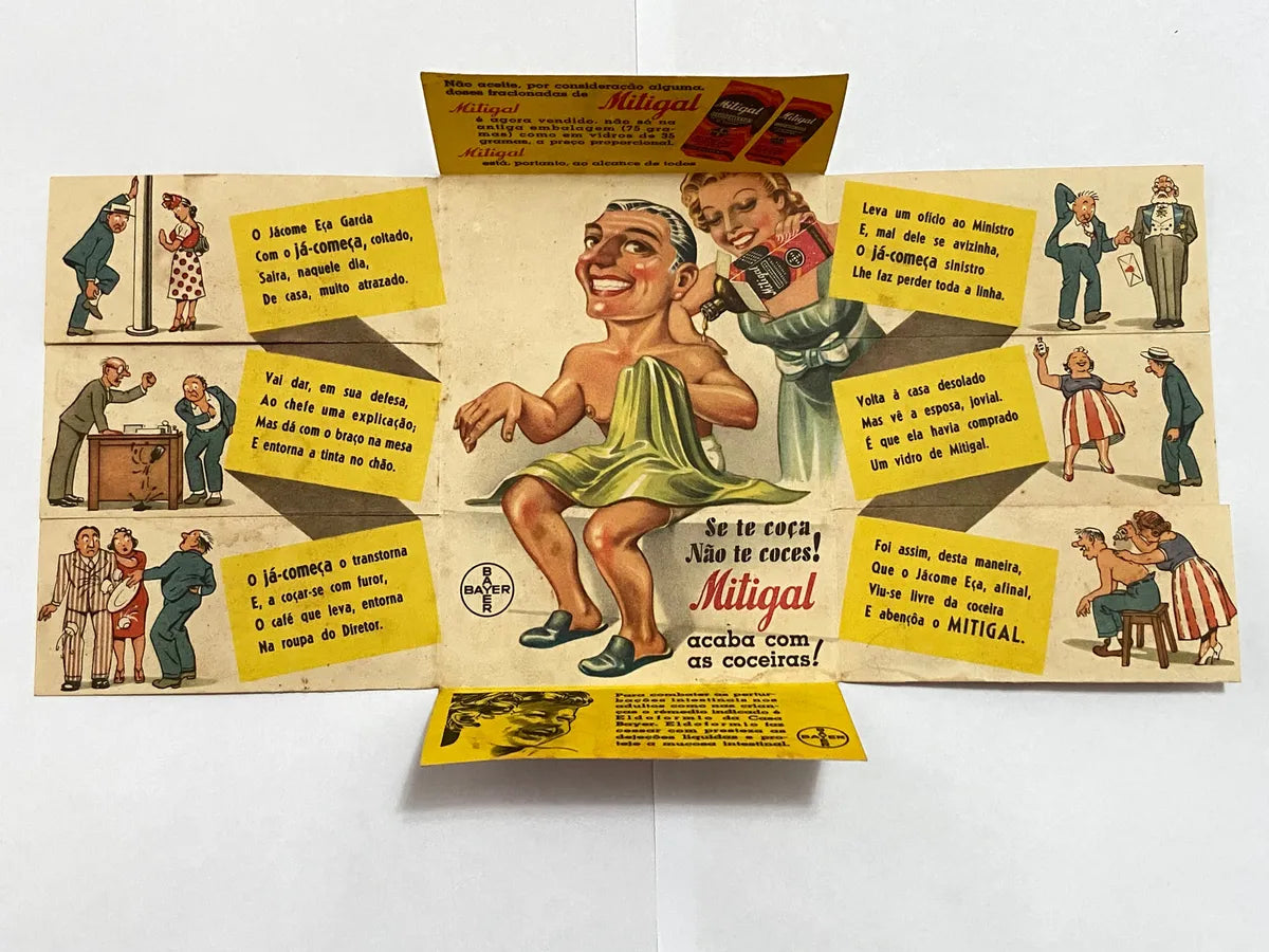 Raro brinde publicitário vintage da Mitigal, distribuído pela Casa Bayer, década de 1940 ou 1950, este folheto ilustrado traz personagens cômicos e um texto rimado que promove o produto Mitigal de forma criativa e divertida.
