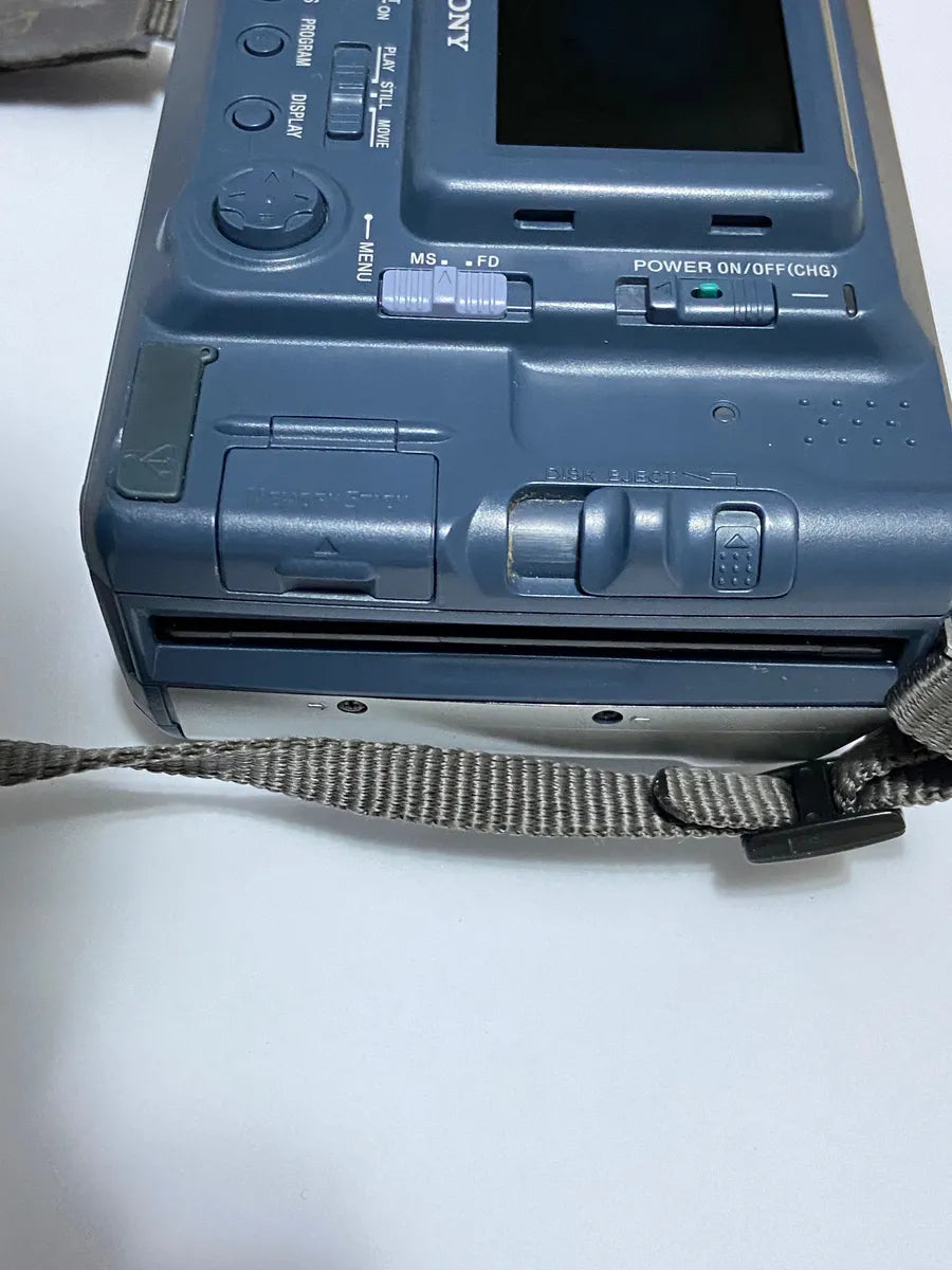 Possui entrada para disquete e suporte a Dual Media (Memory Stick e disquete de 3.5"), flash embutido, zoom, e suporte de mão com alça original. Destaque para os adesivos originais da época destacando sua bateria de longa duração ("Stamina") e capacidade de até 1600 fotos.