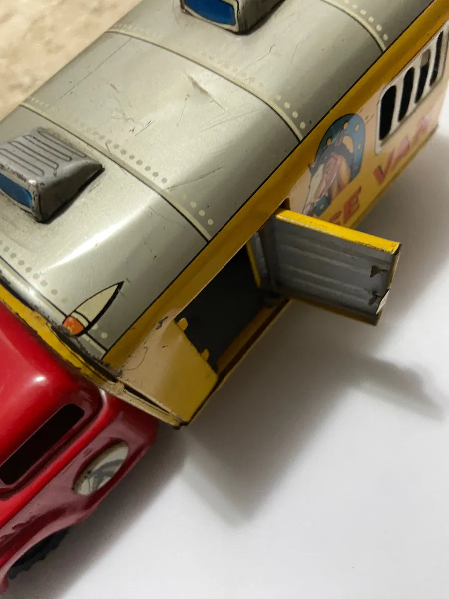 Possui pintura original nas cores vermelho e amarelo, ilustrações temáticas de cavalos e detalhes retrô como sirenes no teto. A estrutura é toda em lata, típica dos brinquedos fabricados entre as décadas de 1950 e 1960.