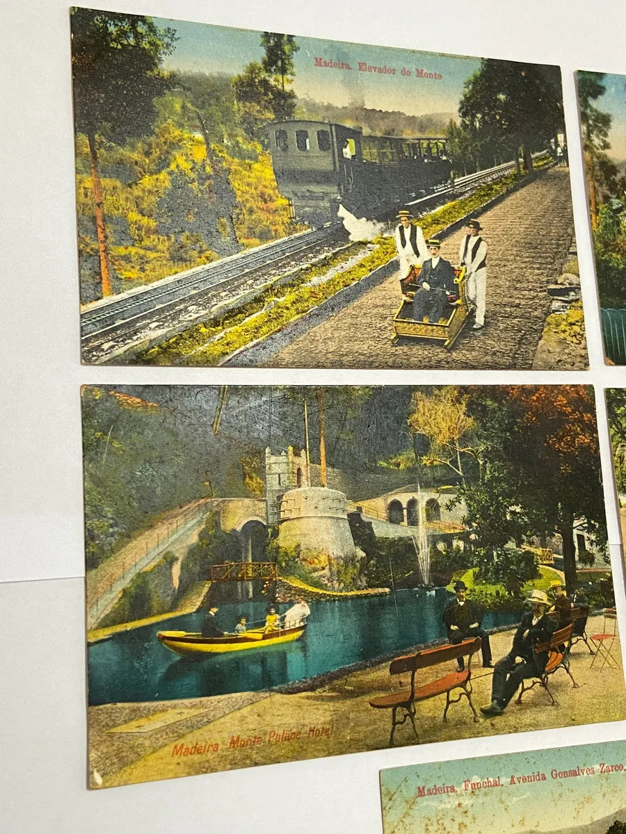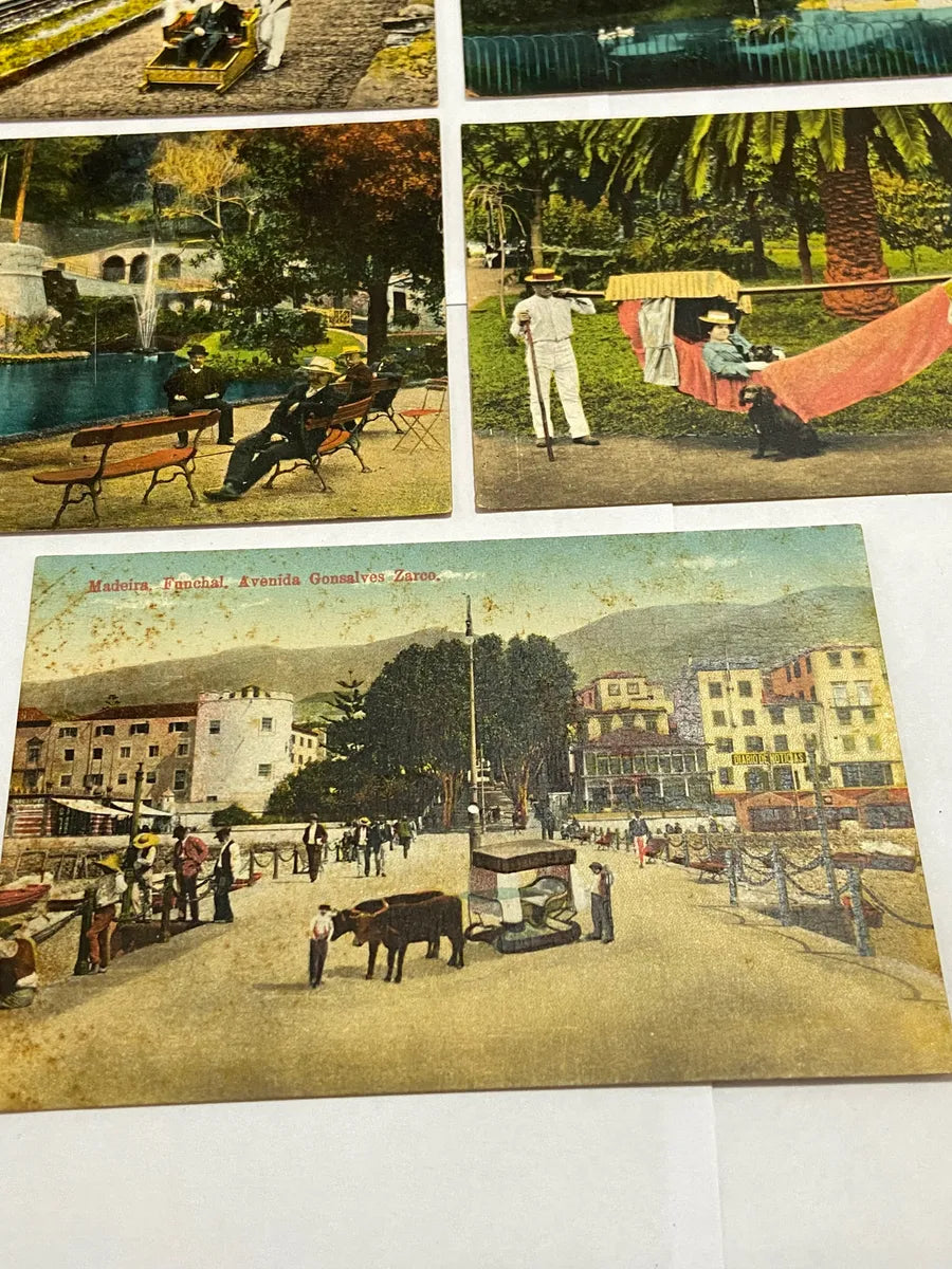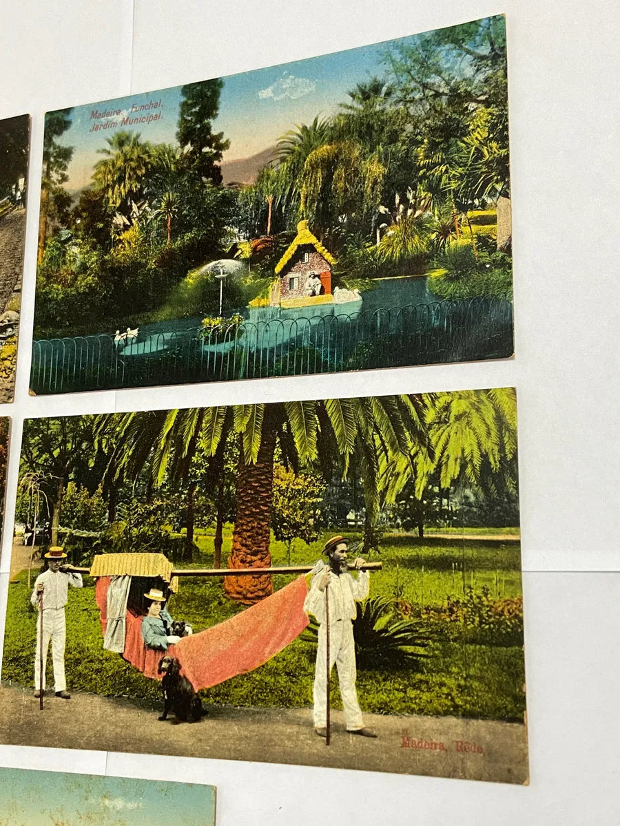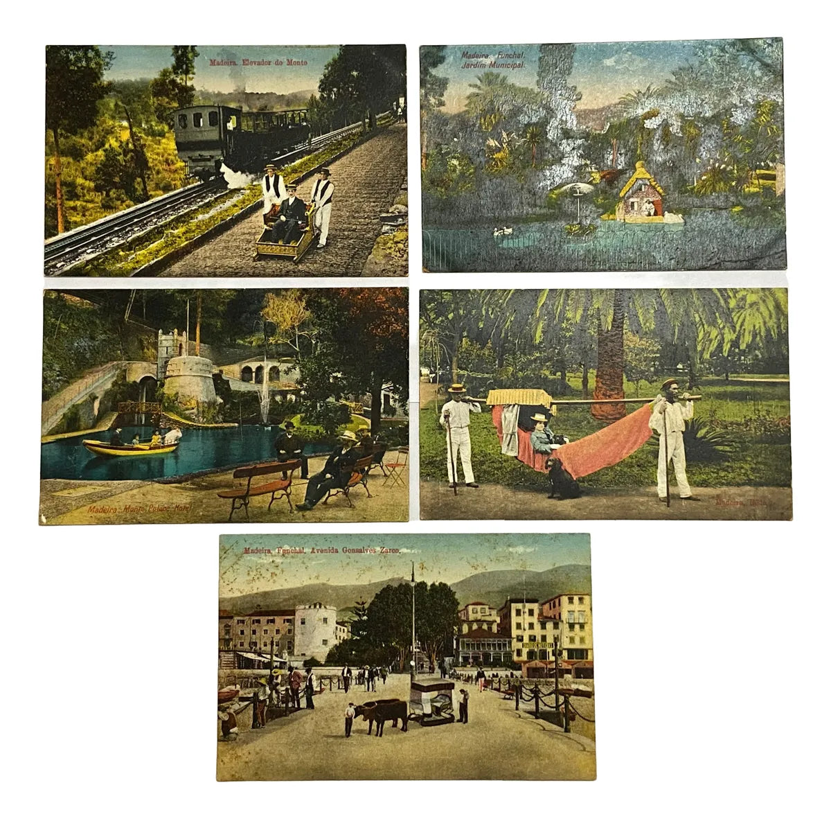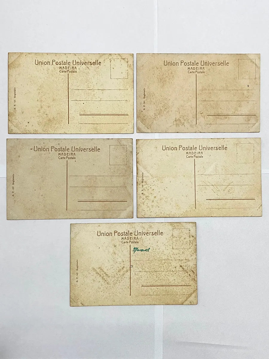 Conjunto com 5 cartões postais antigos, colorizados à mão, retratando paisagens e cenas típicas da Ilha da Madeira, Portugal. Todas as peças são impressas com a inscrição "Union Postale Universelle – Madeira – Carte Postale" no verso, indicando produção para circulação internacional no início do século XX.