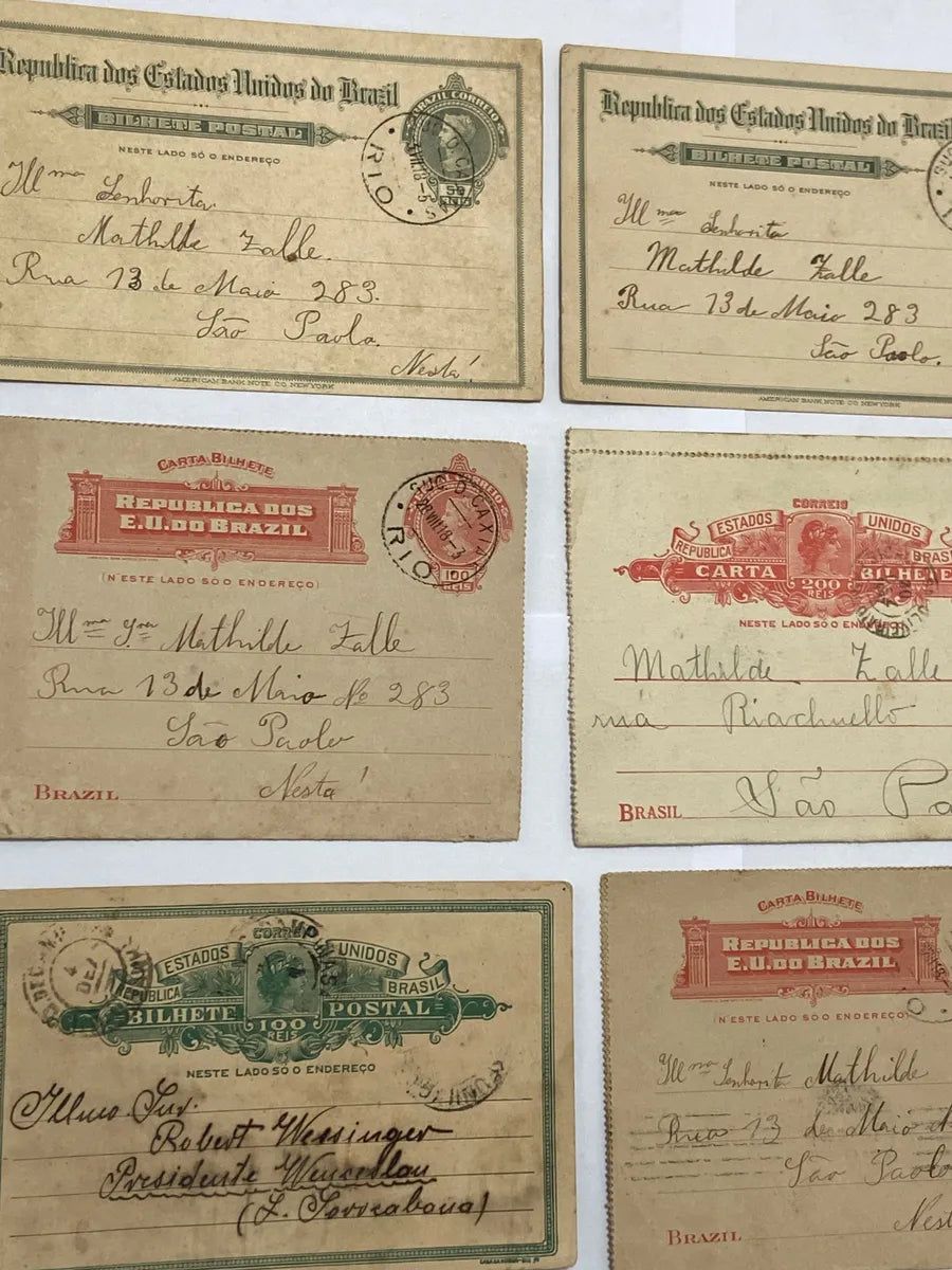 Lote de Bilhetes postais oficiais da República dos Estados Unidos do Brasil, datados do final do século XIX e início do século XX. Peças autênticas de época, com selos impressos e carimbos postais originais. Endereçados e manuscritos, preservam a história das comunicações no Brasil.