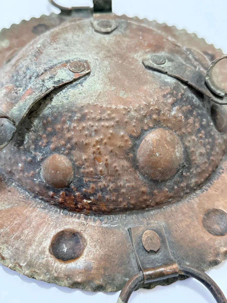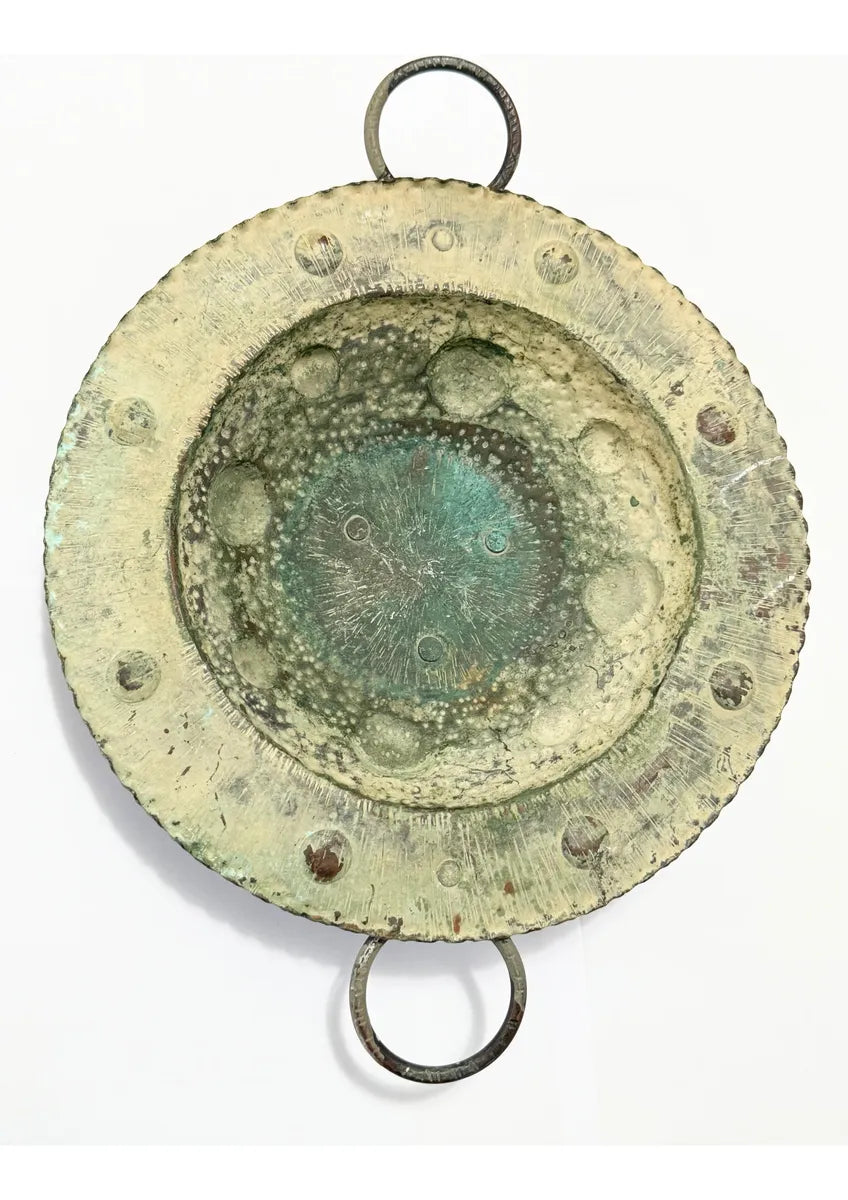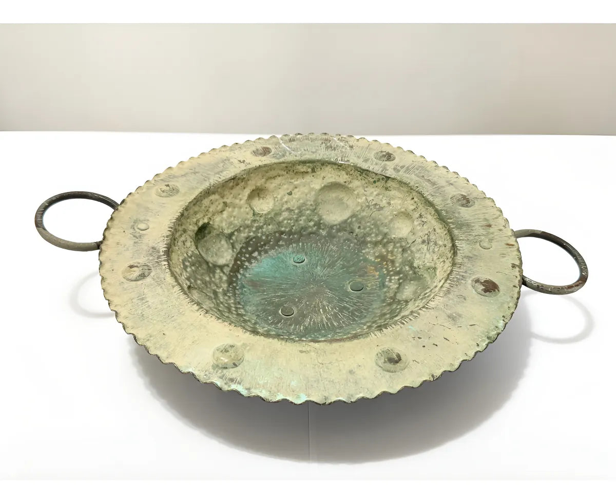 Peça antiga em cobre martelado, com alças laterais e detalhes em relevo. Apresenta pátina natural do tempo, conferindo charme e autenticidade à peça. Mede 23cm de diâmetro.