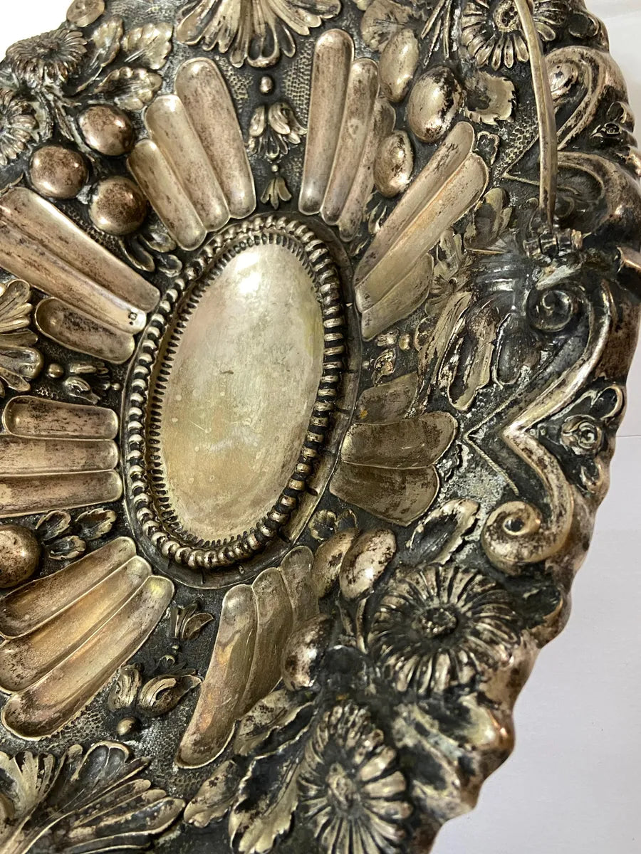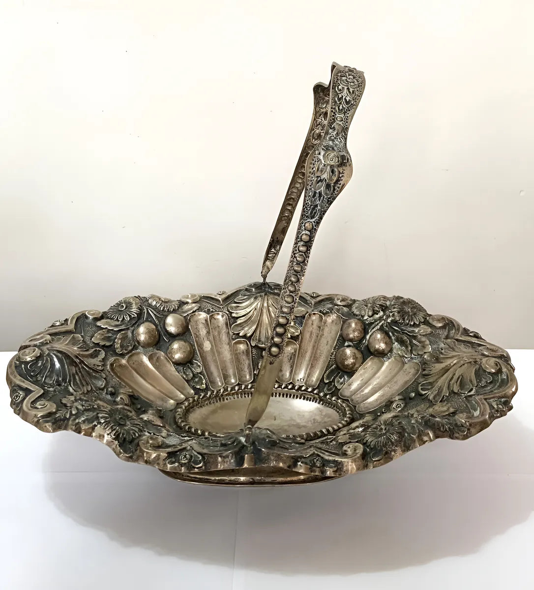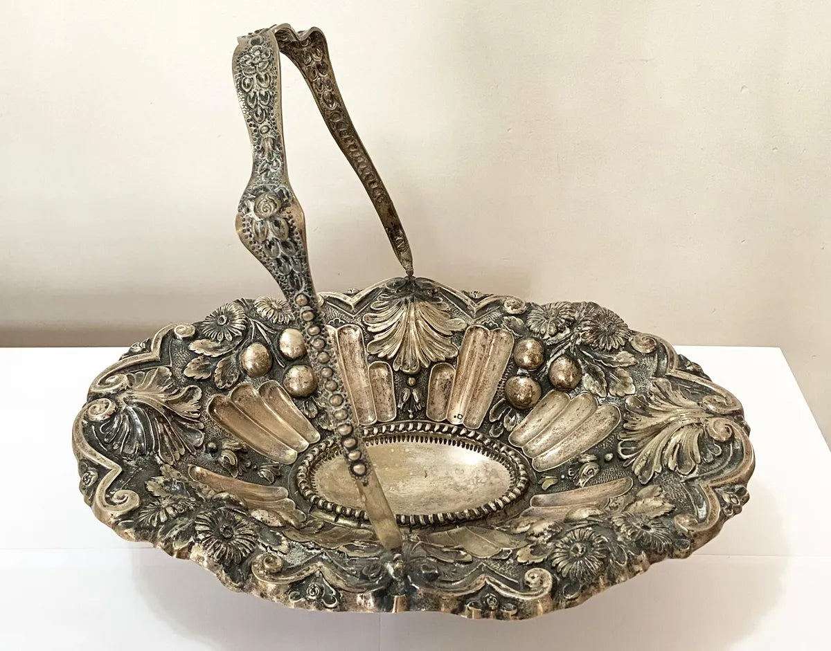 Rara cesta antiga em prata Portuguesa contrastada, com 756 gramas e ricamente trabalhada em alto-relevo (flores, frutos, conchas e arabescos).