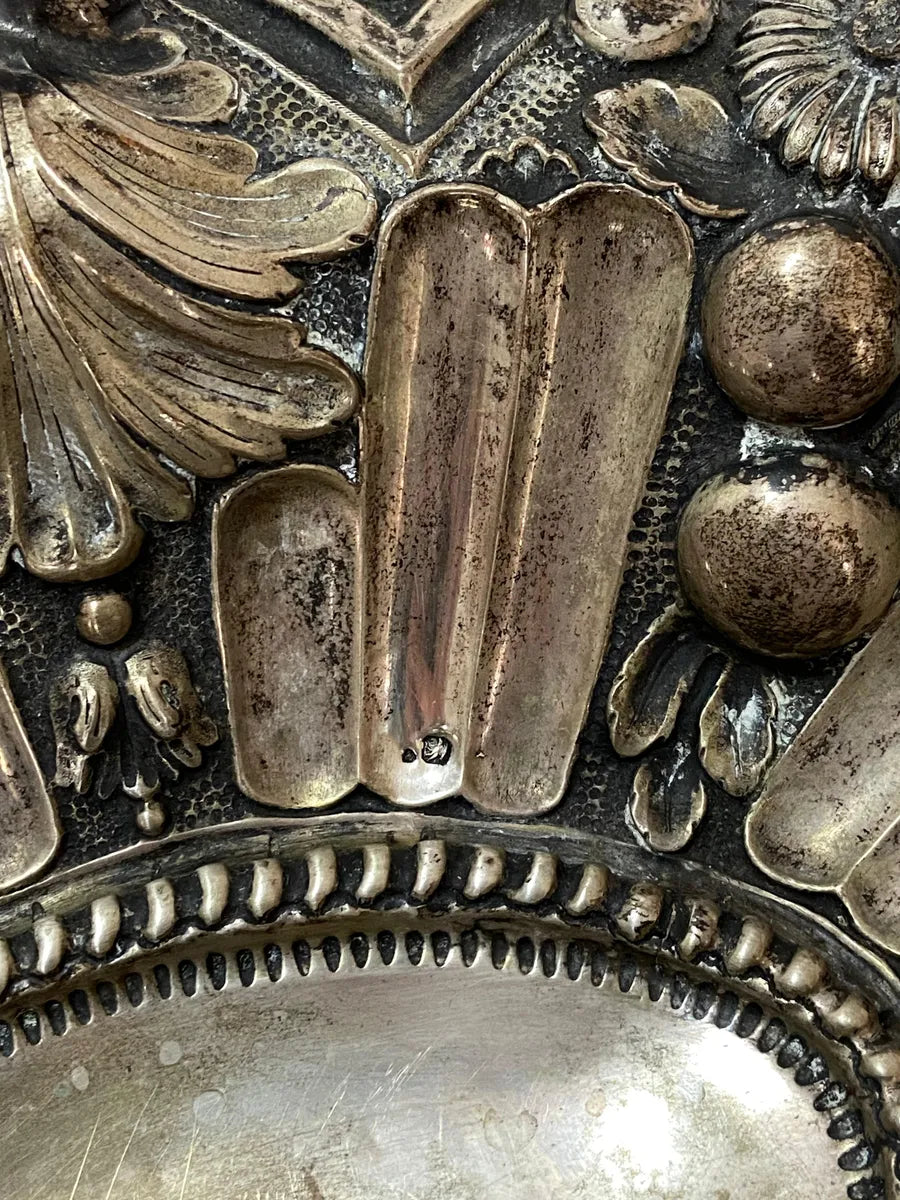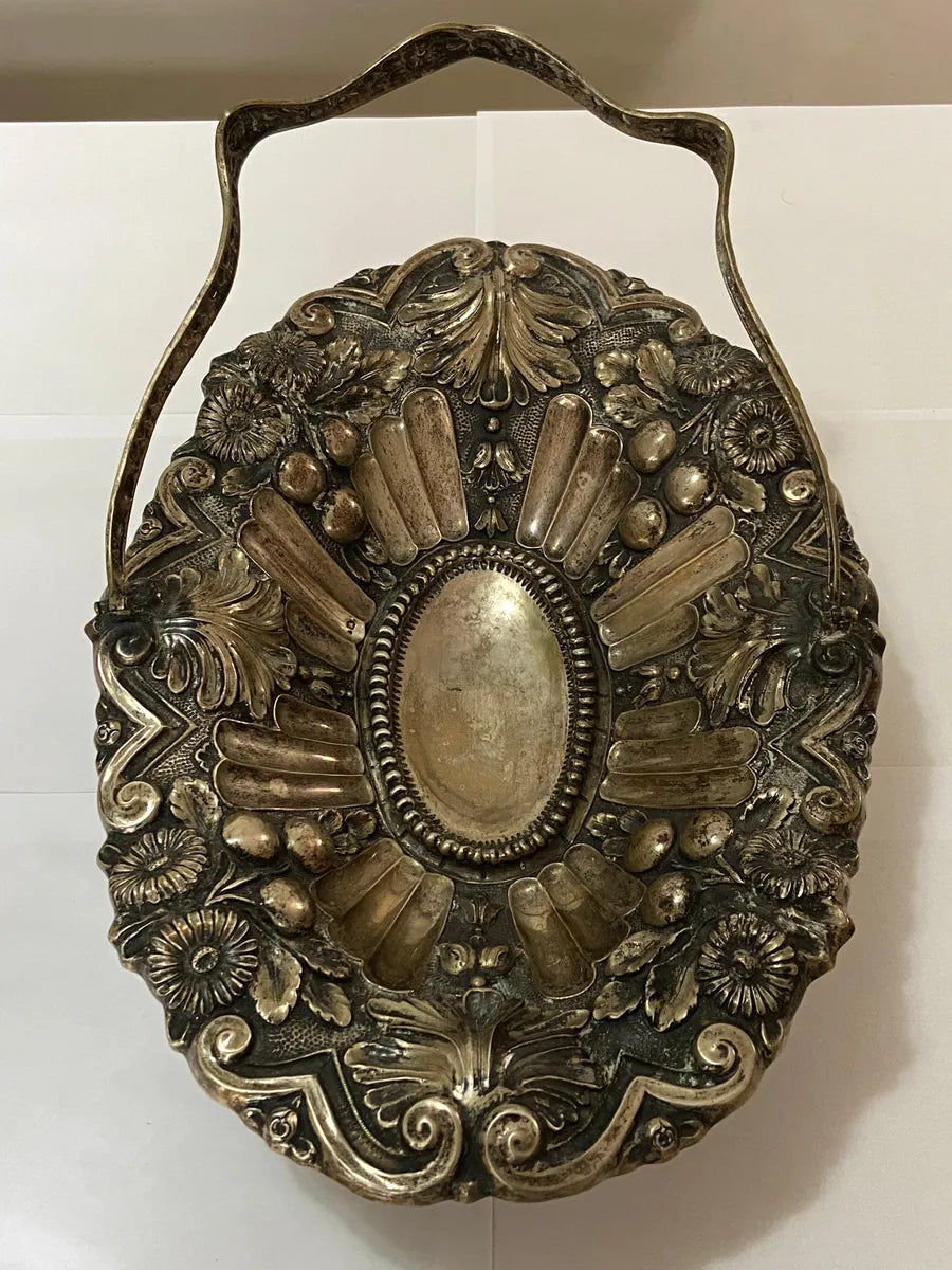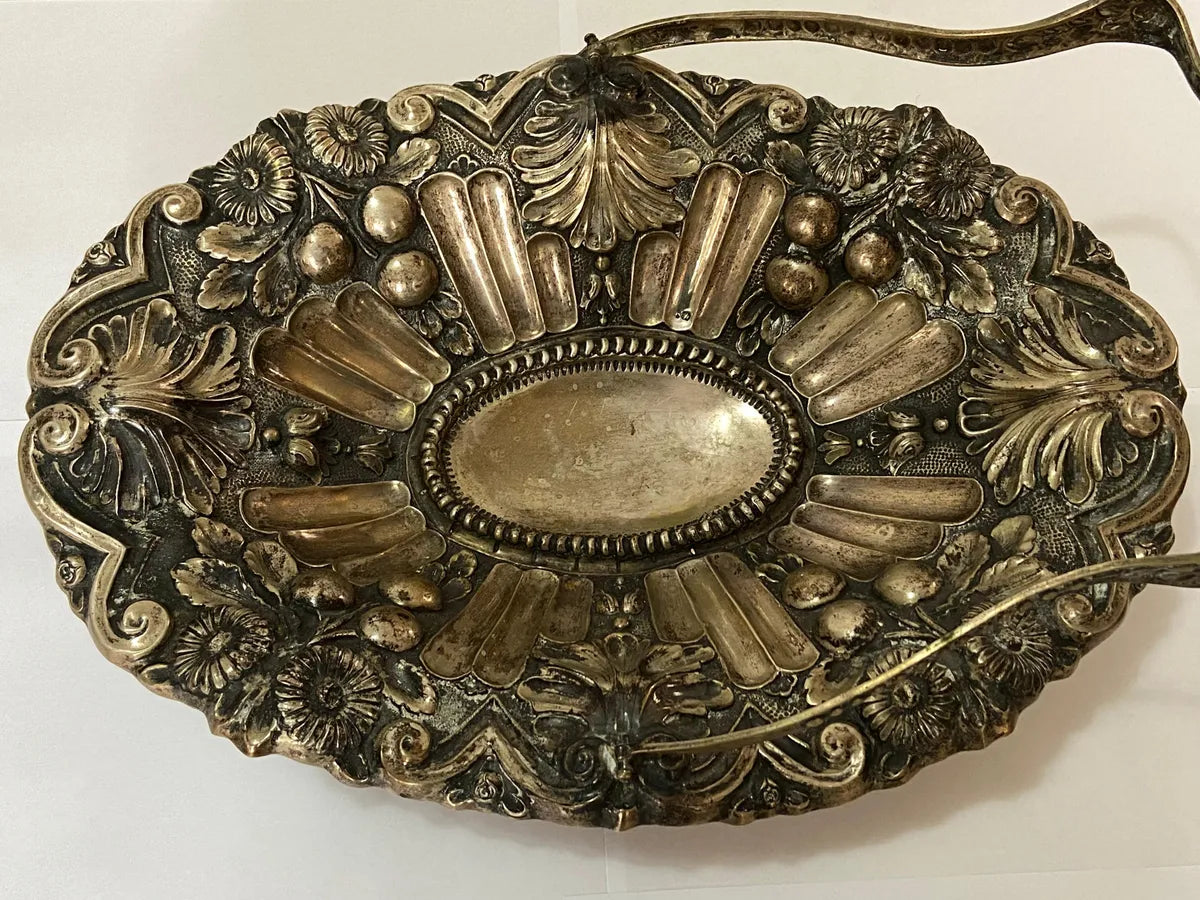 Rara cesta antiga em prata Portuguesa contrastada, com 756 gramas e ricamente trabalhada em alto-relevo (flores, frutos, conchas e arabescos).