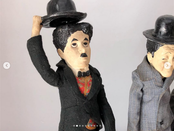 Coleção antiga composta por 5 bonecos representando comediantes clássicos do cinema mudo e da era de ouro da comédia. As figuras são feitas com riqueza de detalhes, vestimentas em tecido costurado à mão e expressões caricatas que remetem aos personagens icônicos de Charles Chaplin, Laurel e Hardy (O Gordo e o Magro), além de outros tipos populares da comédia da primeira metade do século XX.