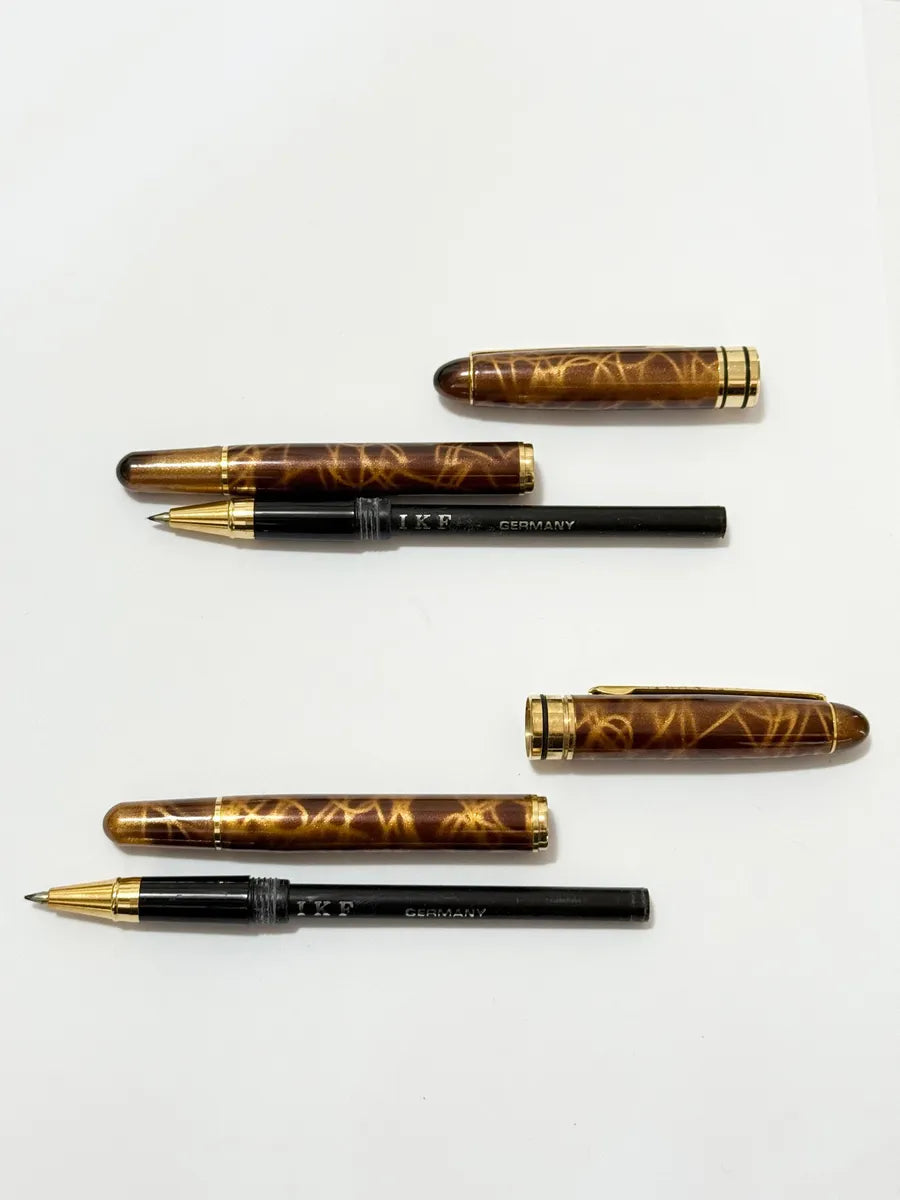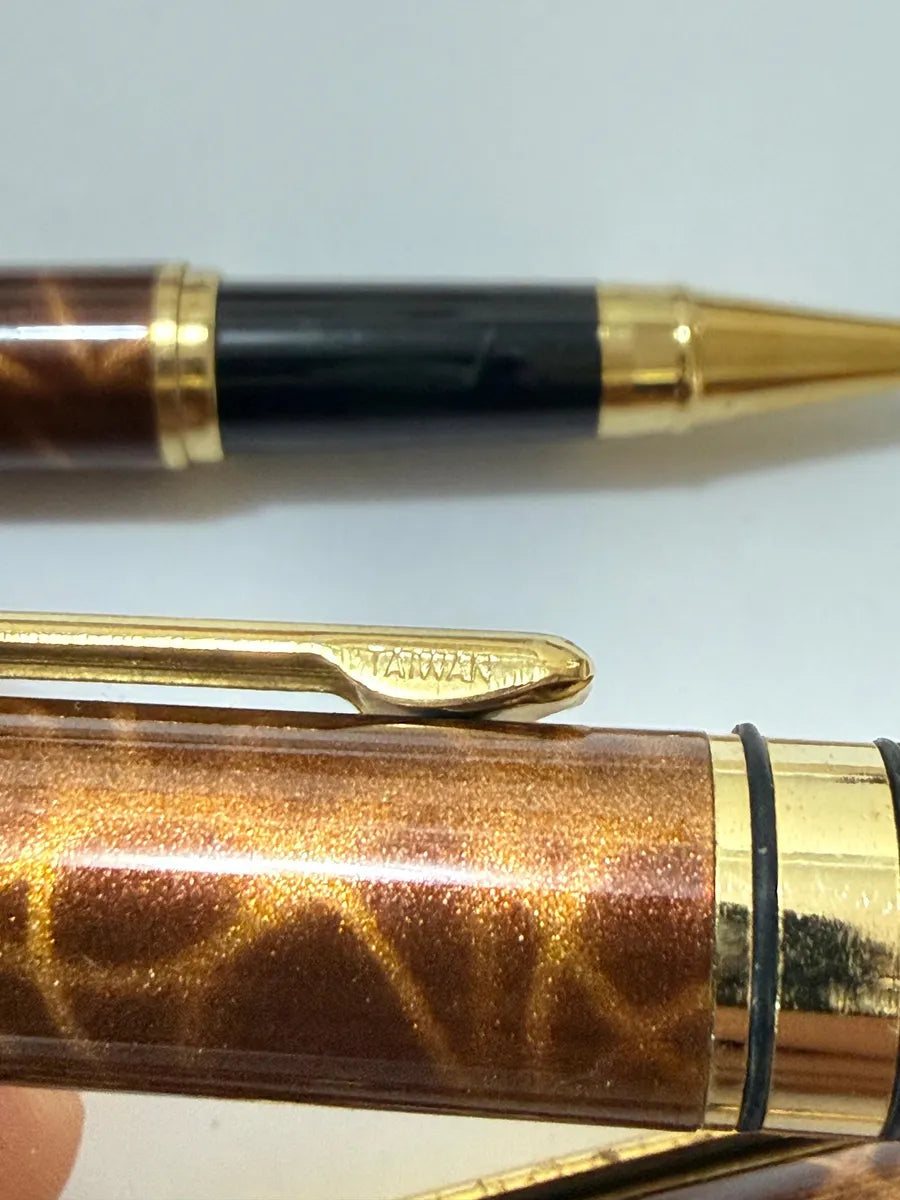 Conjunto elegante de canetas com acabamento marmorizado em tom marrom, detalhes dourados e estojo rígido original.