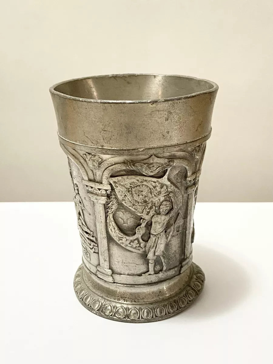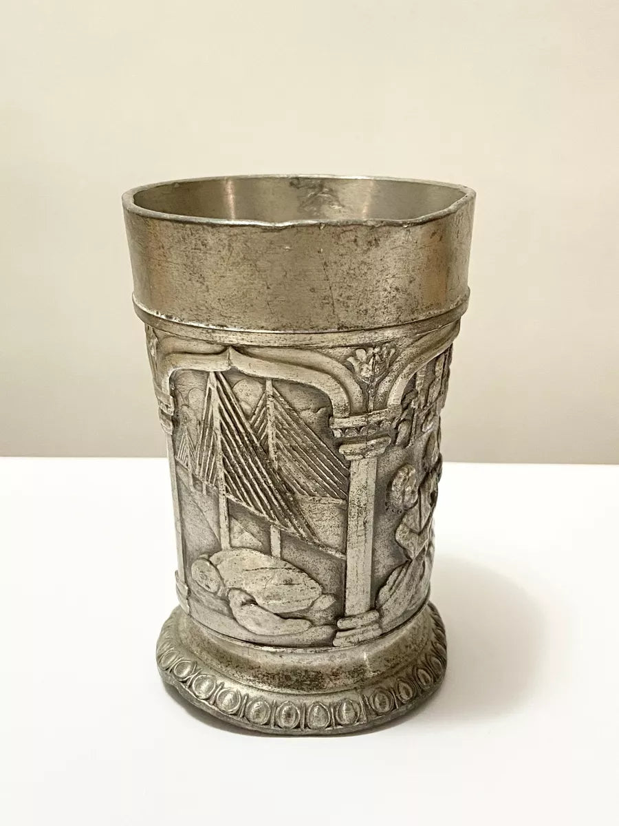 Copo Antigo Estanho Tumasek Pewter Malasia Cenas Em Relevo