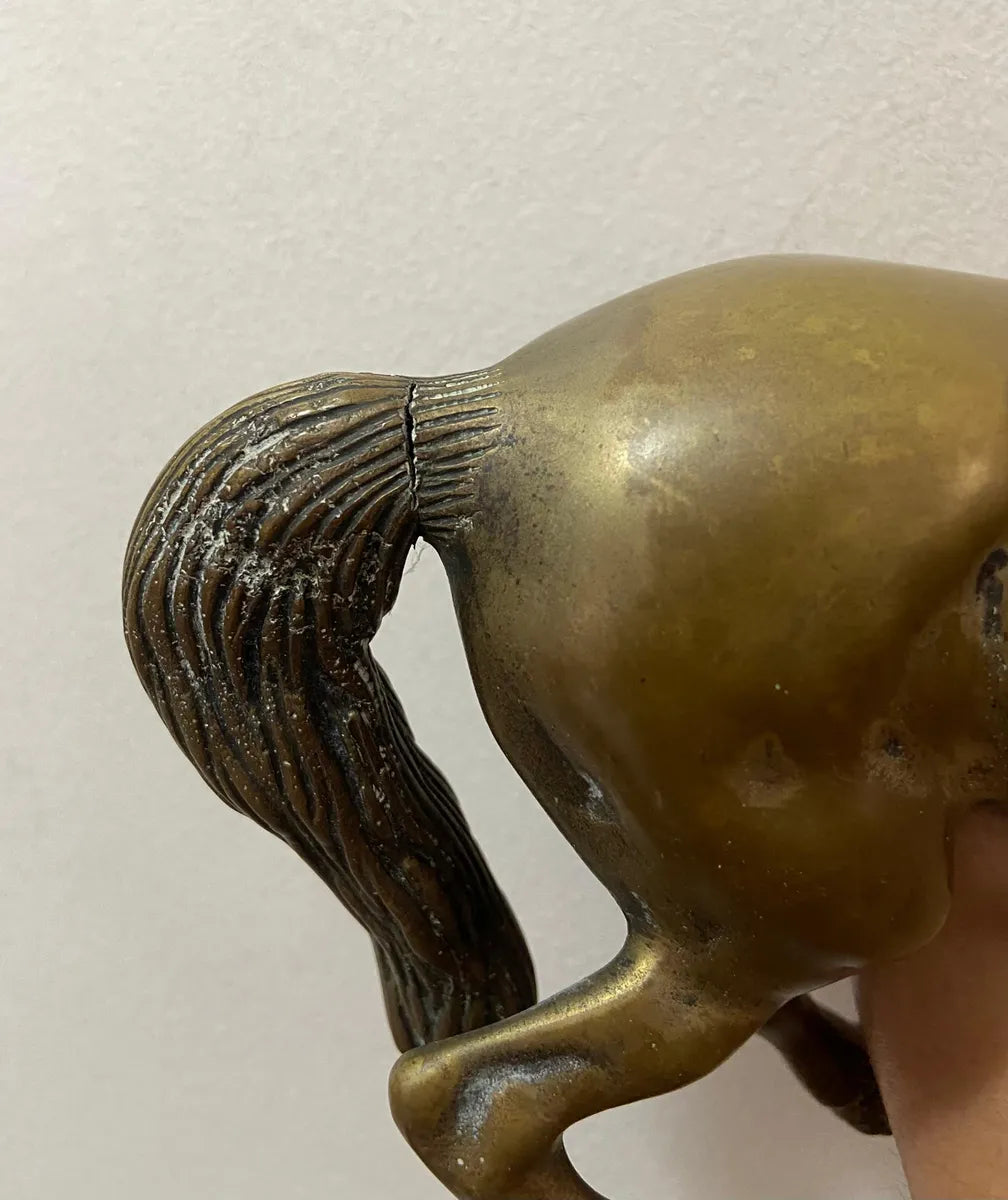 Escultura antiga em bronze maciço representando um cavalo em movimento, trabalhada com riqueza de detalhes e realismo. A postura firme e a crina esculpida transmitem elegância e força, tornando a peça uma verdadeira obra de arte decorativa.