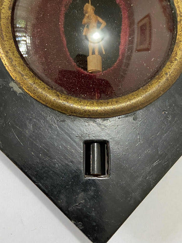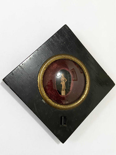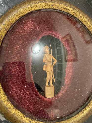 Peça antiga de parede com escultura em miniatura de soldado segurando espada, esculpida em madeira com detalhes finos. A figura está protegida por vidro convexo e moldura de madeira preta com aro dourado. O interior possui fundo aveludado vermelho. Mecanismo giratório na parte inferior.