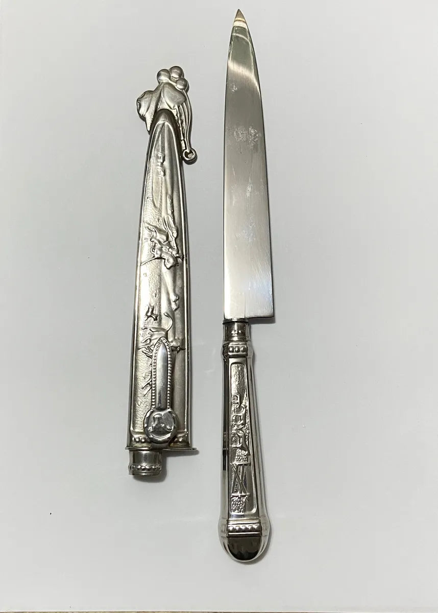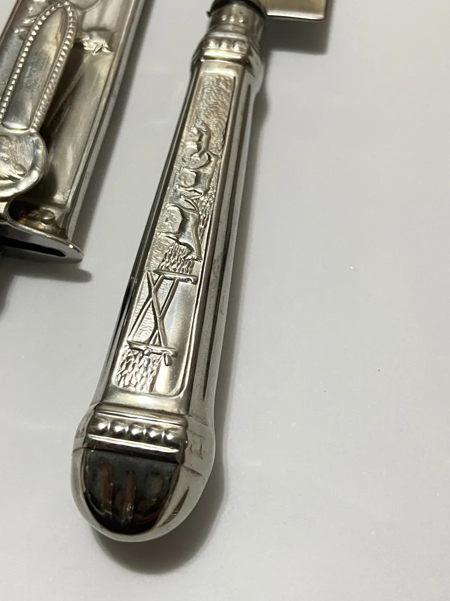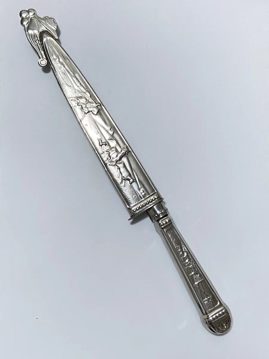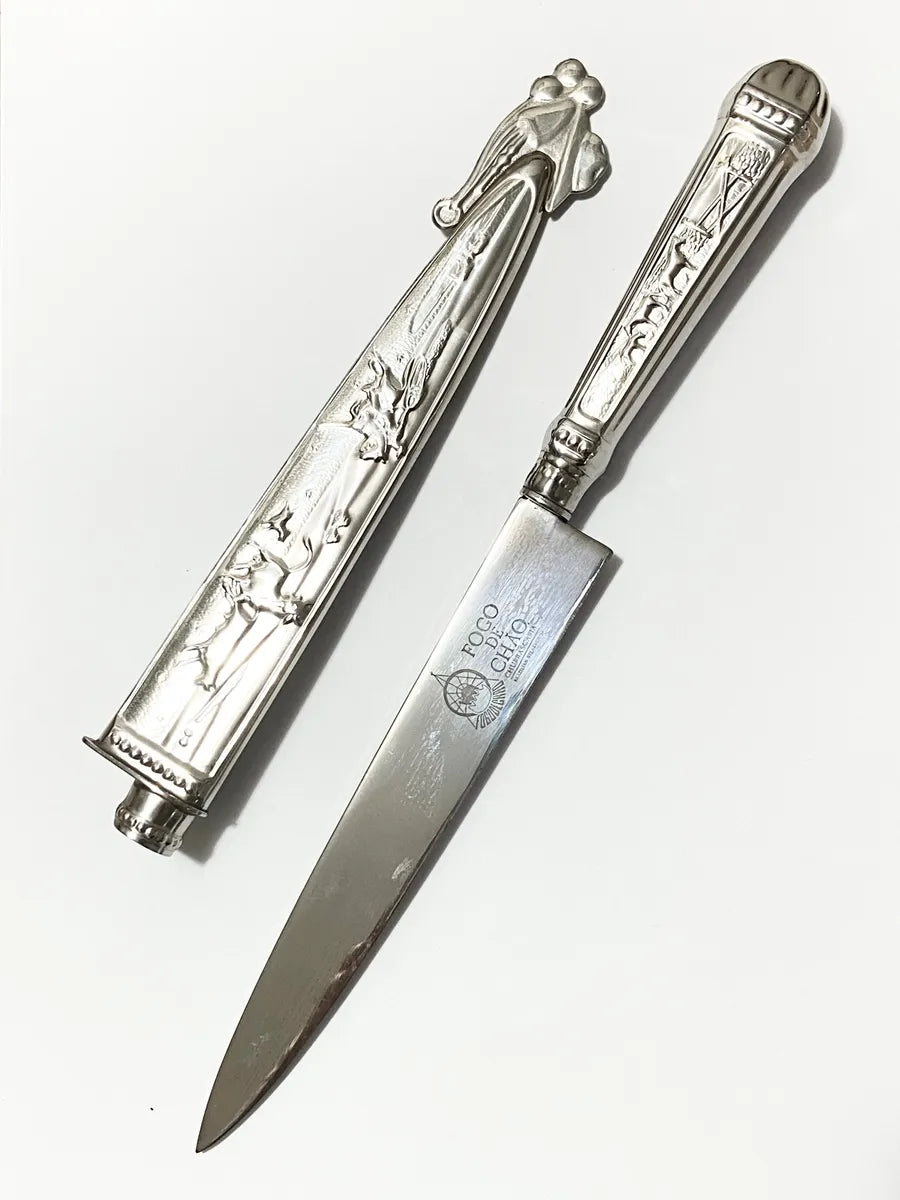 Faca artesanal com marca da Churrascaria Fogo de Chão, com 29 cm de comprimento total. Esta peça impressiona não apenas pela lâmina de aço inox de alta qualidade, mas também pelo requinte do cabo e da bainha, ambos trabalhados com ricos detalhes em relevo. As figuras em alto-relevo remetem a cenas clássicas do campo e da cultura gauchesca, tornando esta faca uma verdadeira obra de arte funcional.