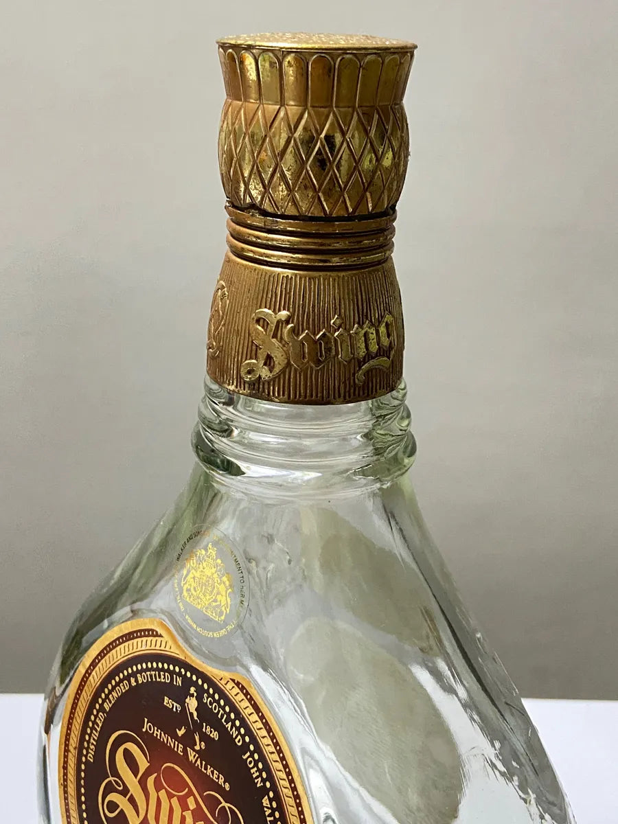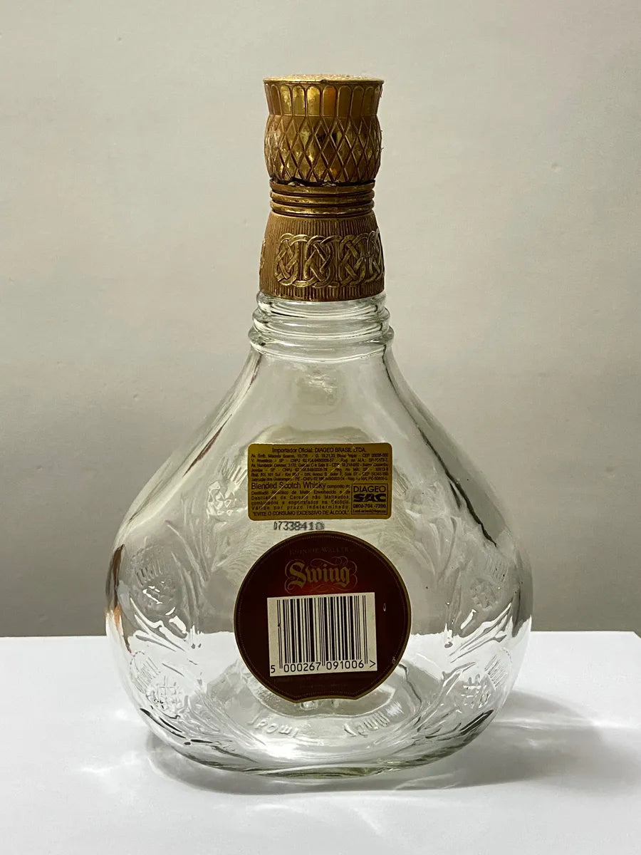 Garrafa vazia original do whisky Johnnie Walker Swing, em vidro grosso e resistente, com tampa metálica dourada em excelente estado de conservação.
