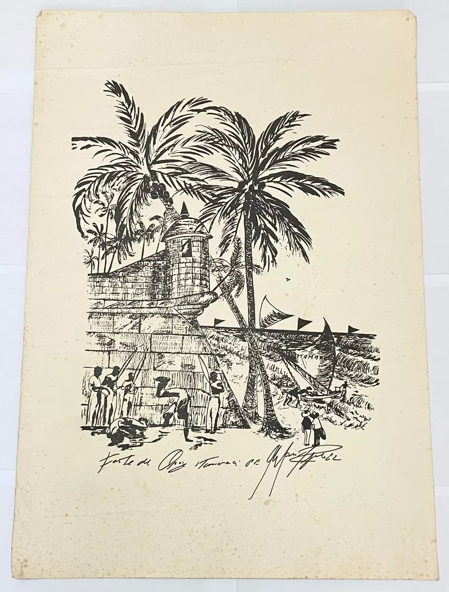 Gravura Antiga Paisagem Com Forte E Coqueiros Assinada