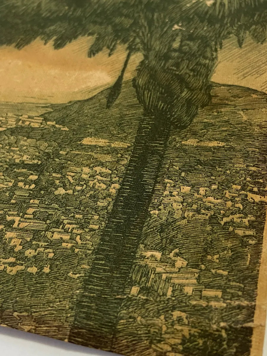 Gravura antiga impressa sobre papel pardo, medindo 28 x 16,5 cm, retratando uma vista icônica do Pão de Açúcar e da Baía de Guanabara, no Rio de Janeiro. A composição apresenta rica vegetação em primeiro plano e um detalhado traçado urbano ao fundo, evocando um estilo gráfico clássico, possivelmente de meados do século XX.
