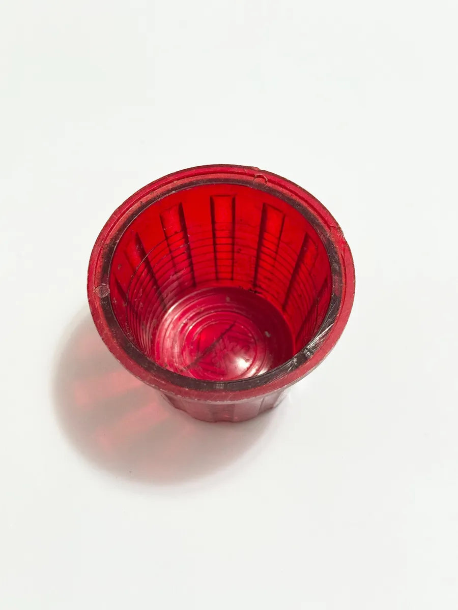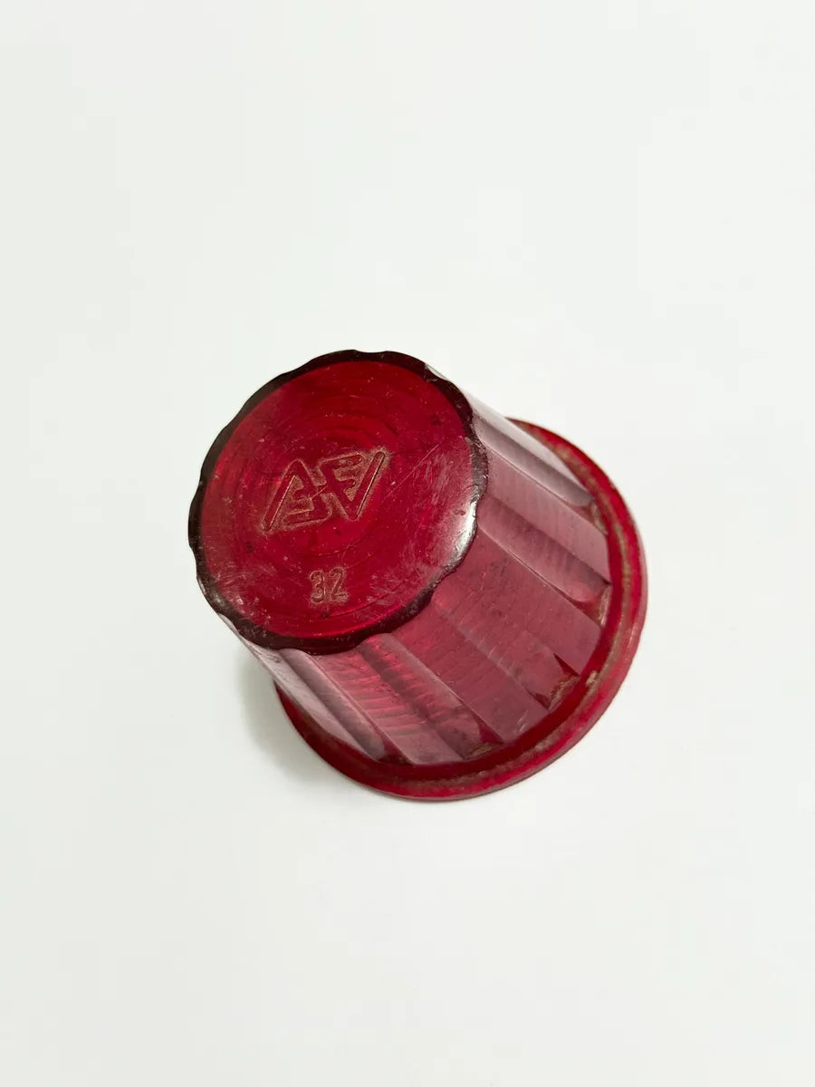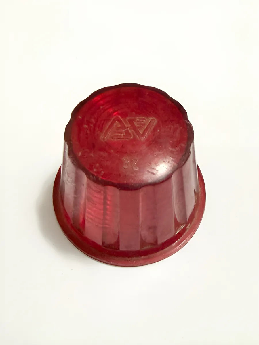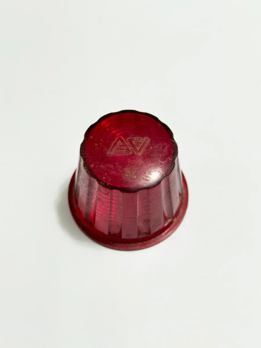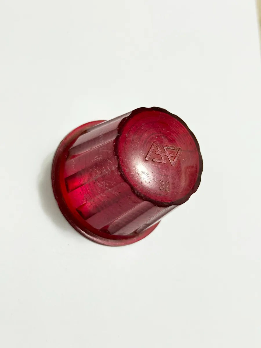 Lente indicadora antiga em acrílico vermelho translúcido, ideal para reposição ou restauração de painéis, lanternas e equipamentos industriais ou automotivos vintage.