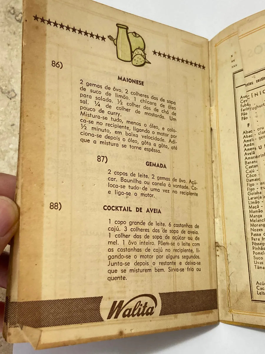 Receituário original do liquidificador Walita, um item raro e altamente colecionável, oferecido como brinde pela Eletro-Indústria Walita S.A. A peça possui ilustração estilizada do modelo clássico de liquidificador Walita, com capa em tons de amarelo e vermelho. O folheto demonstra os esforços da marca em difundir o uso do eletrodoméstico na época, oferecendo receitas práticas para o dia a dia.