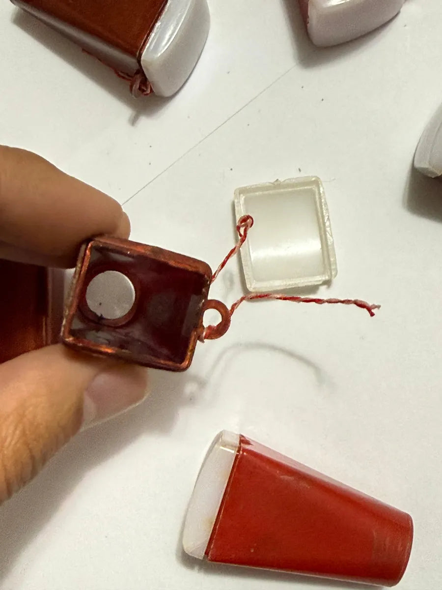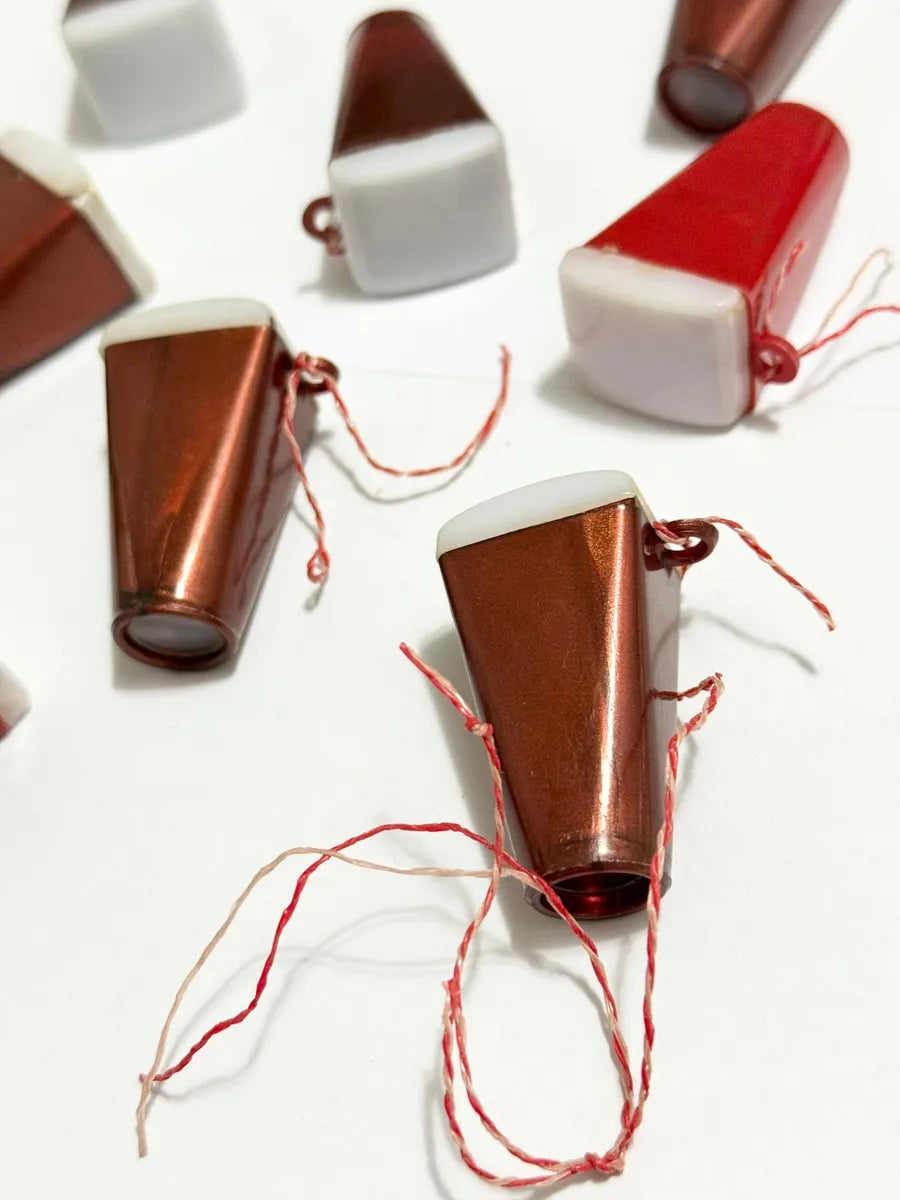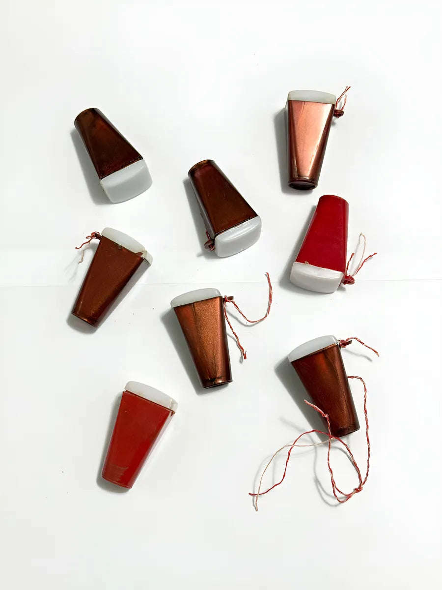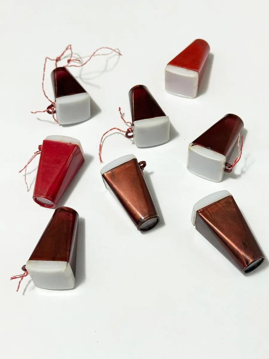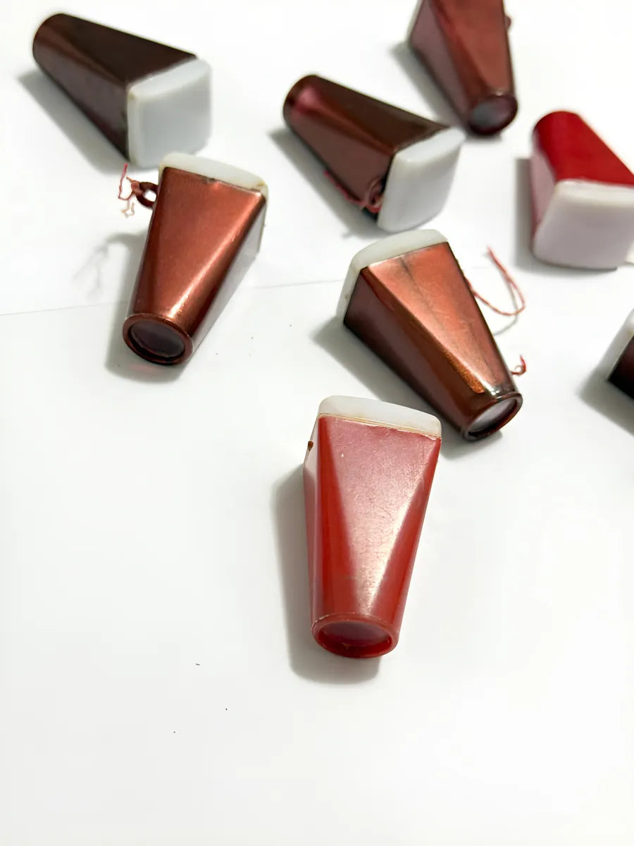 Conjunto com 8 monóculos antigos em baquelite, nas cores marrom e vermelho, com lente translúcida na ponta. Peças originais de época.