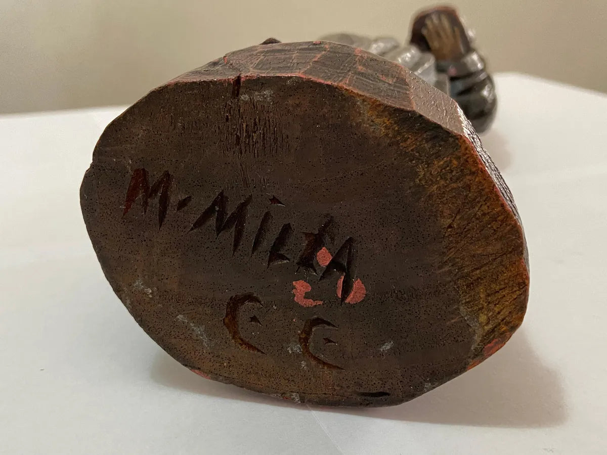 Escultura em madeira representando São Francisco de Assis, com animais aos ombros e nas mãos, entalhada com traços expressivos e acabamento rústico. A peça é assinada na base pelo artista M. Milza, conforme fotos.