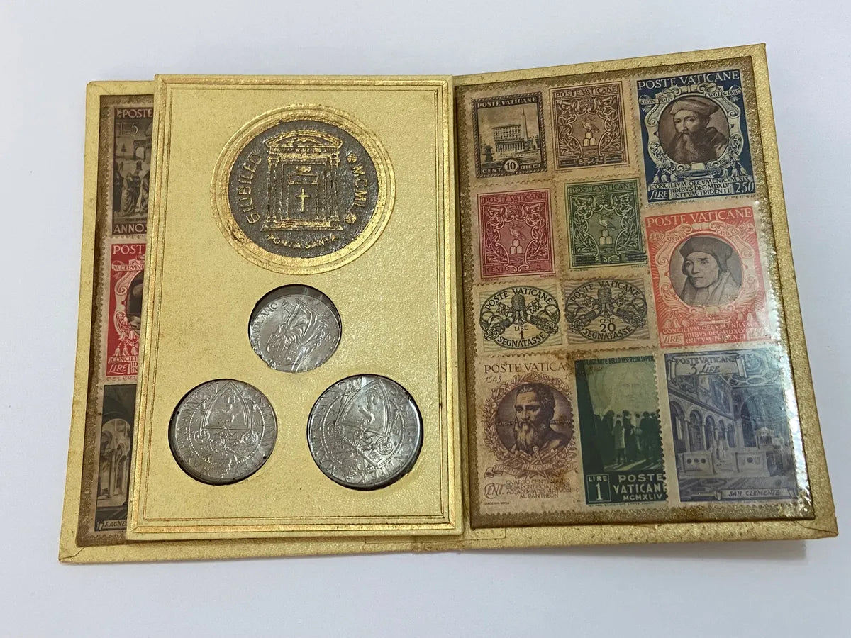 Antigo Souvenir Vaticano Ano Santo 1950 com Moedas e Selos