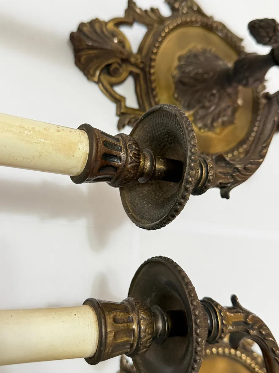 Par de arandelas de parede antigas em bronze maciço, estilo Clássico Francês Luís XV, ricamente ornamentadas com arabescos e conchas. Cada arandela possui 3 braços em formato de vela.