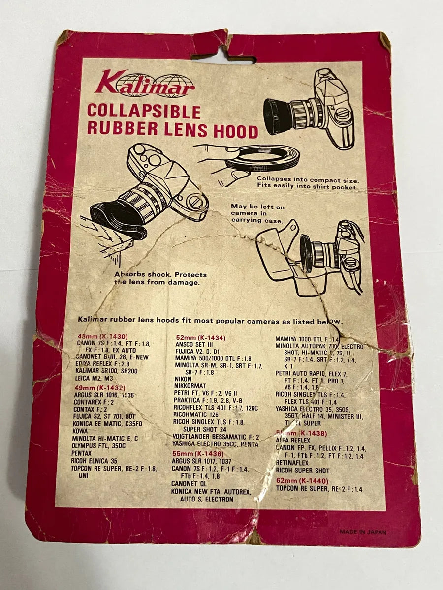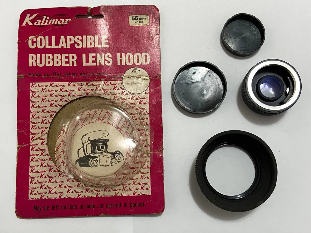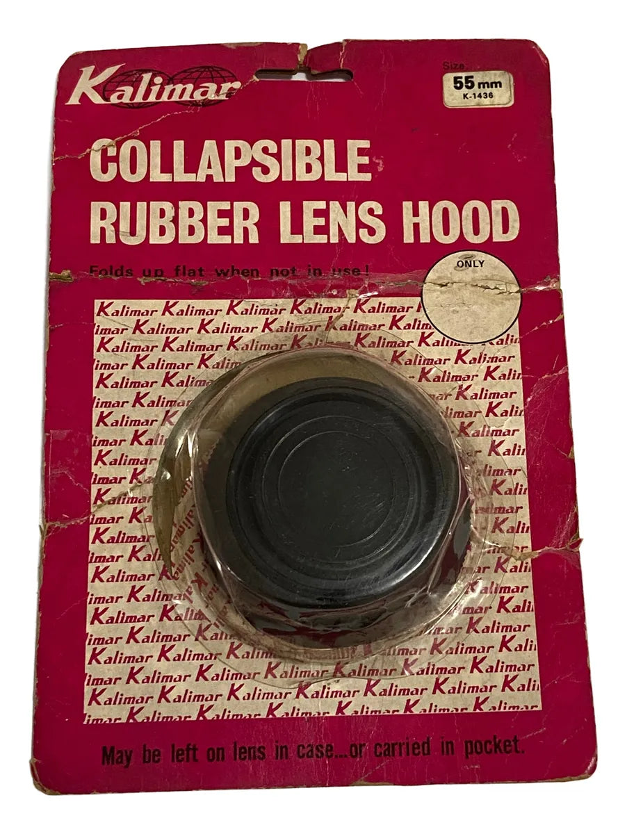 Parasol (lens hood) original Kalimar, modelo retrátil de borracha para lentes com rosca de 55mm. Produto vintage, novo na embalagem original da época. Ideal para colecionadores de fotografia analógica ou para uso em lentes compatíveis.