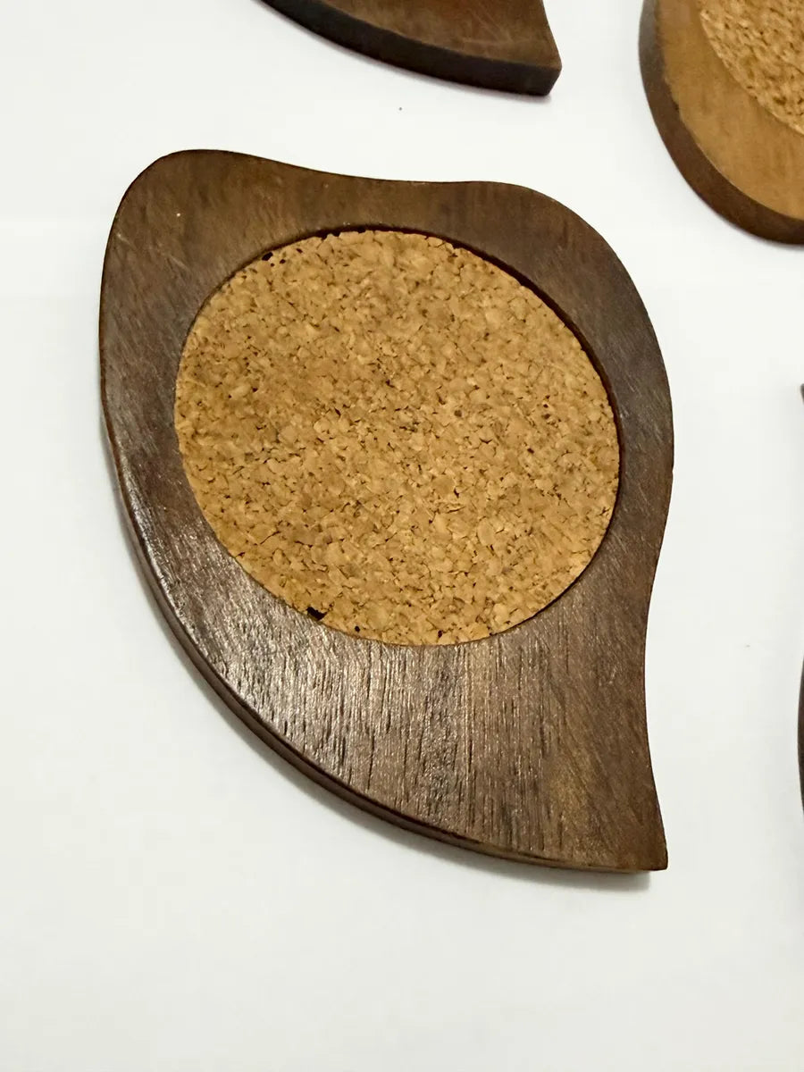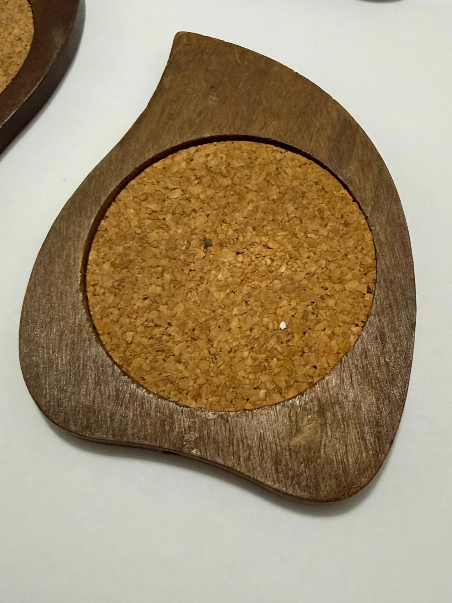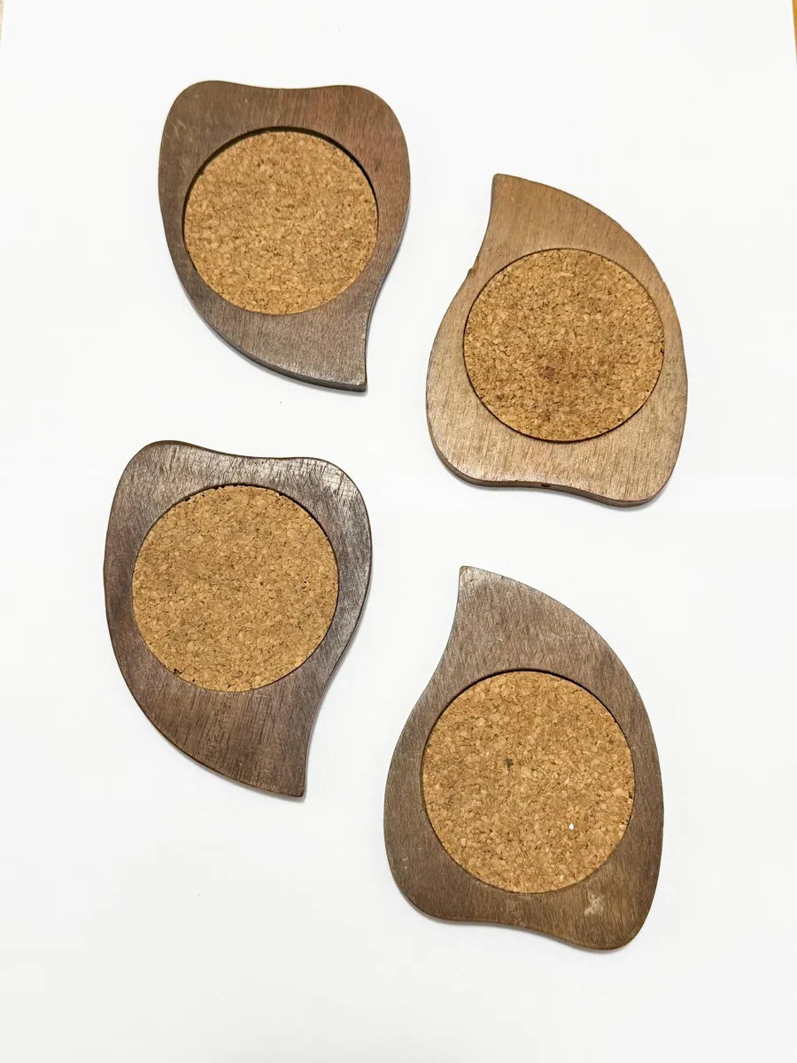 Conjunto com 4 porta-copos em madeira maciça com centro em cortiça natural. Peças artesanais em formato orgânico. Produto original de época.