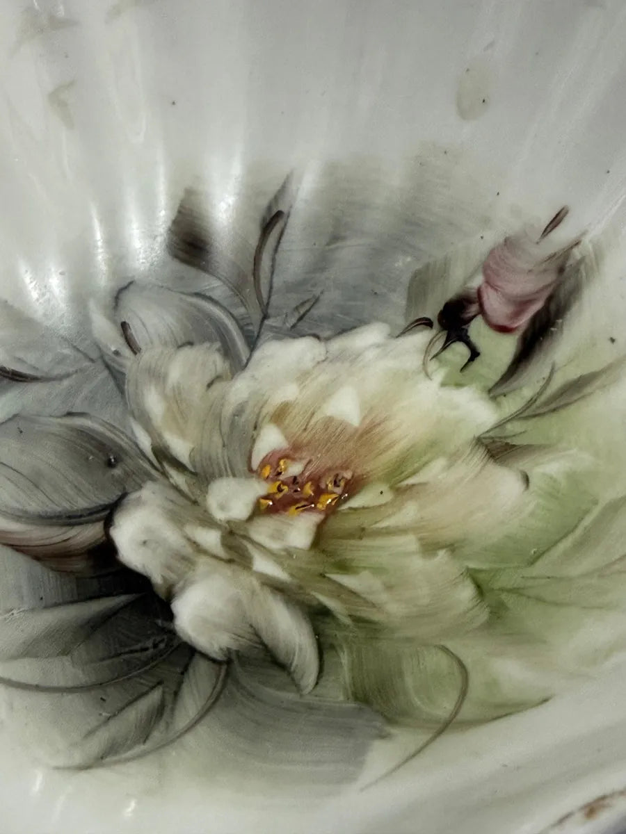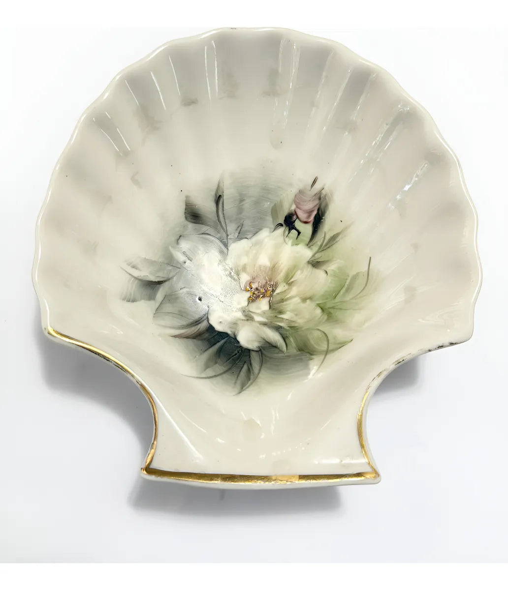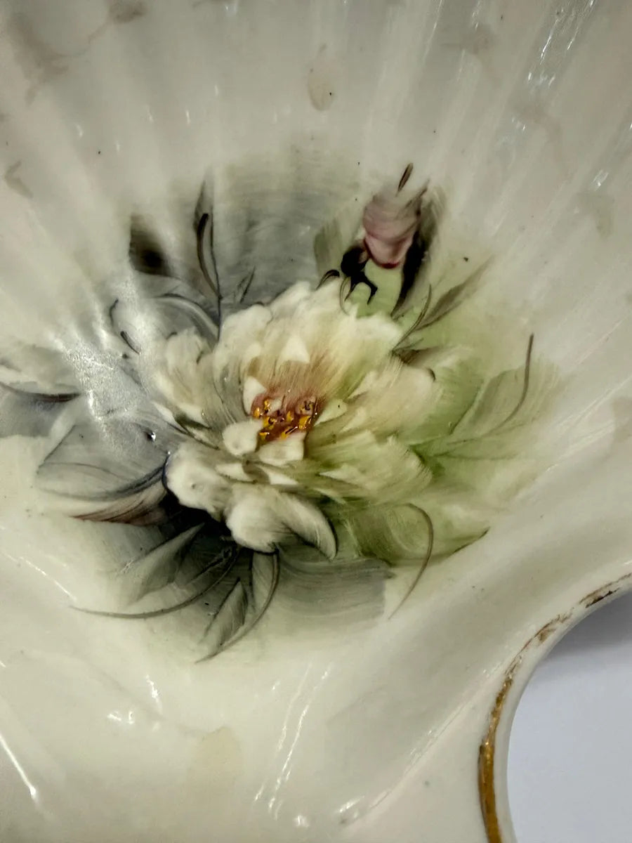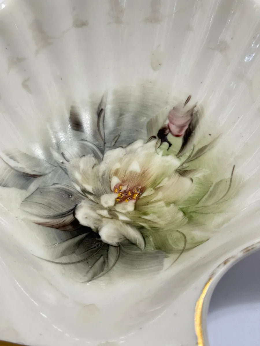 prato decorativo antigo em porcelana, formato de concha, com pintura manual de flores em tons suaves e acabamento em ouro nas bordas.