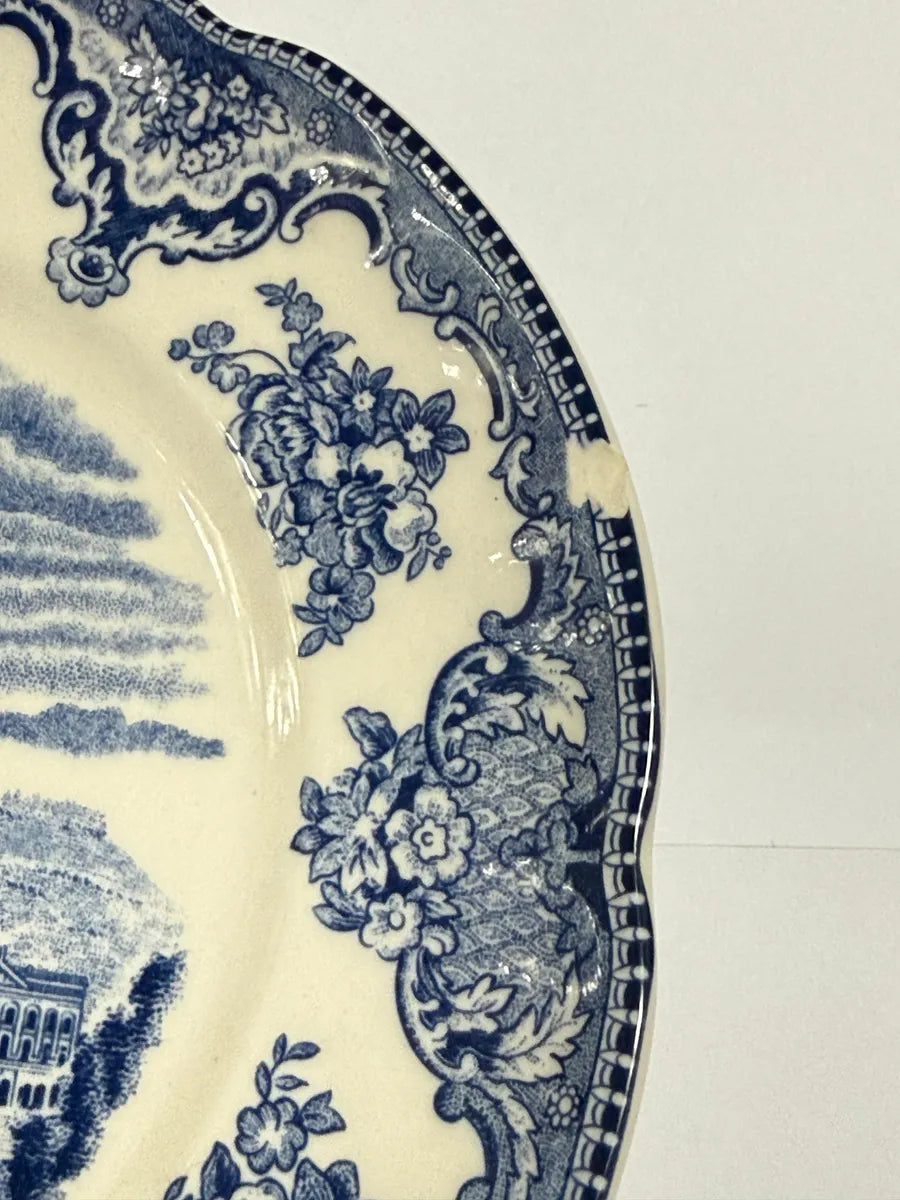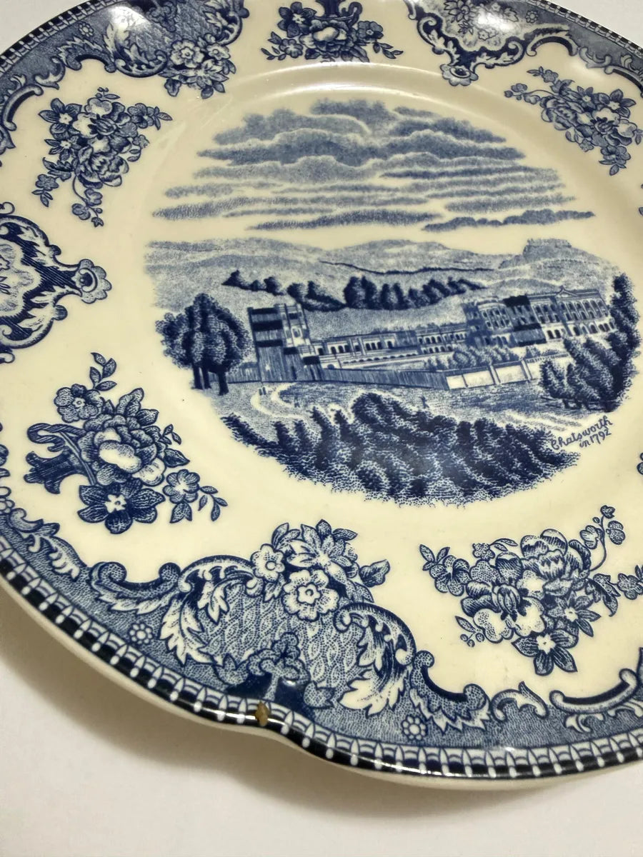 Belo prato decorativo antigo da marca inglesa Johnson Bros, com a clássica estampa azul “Chatsworth 1792”. Peça de cerâmica com bordas ornamentadas e ilustração detalhada de paisagem e arquitetura inglesa.