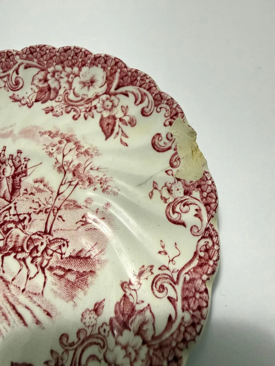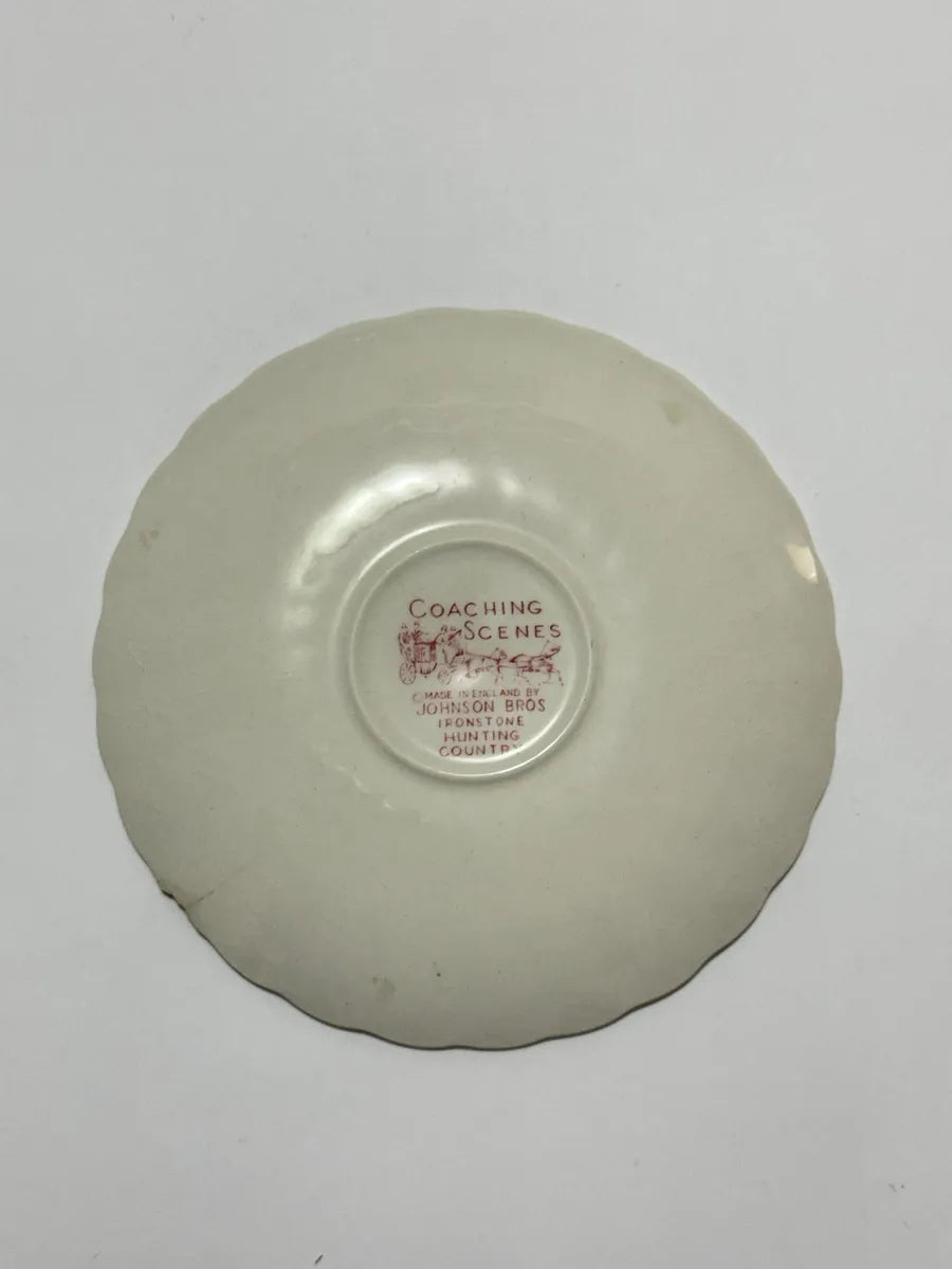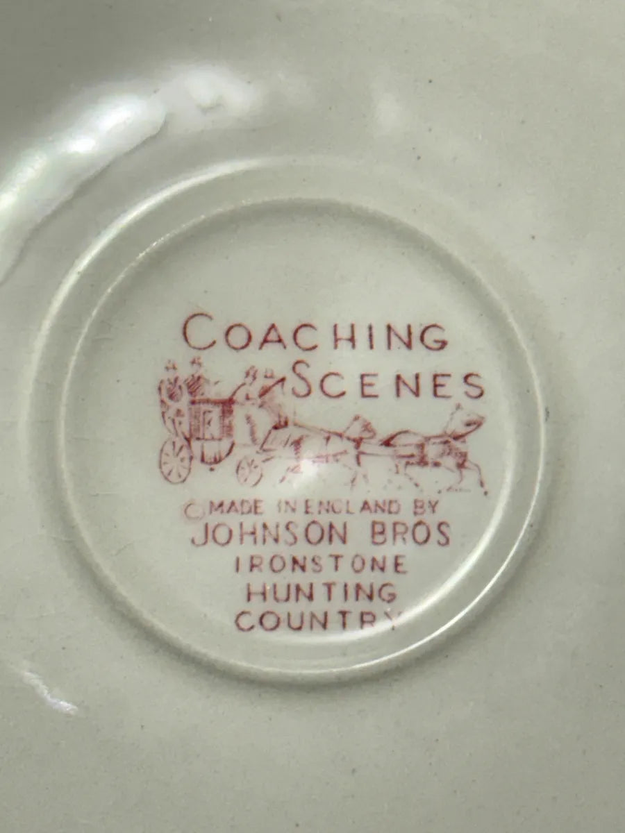 Prato decorativo antigo da renomada fabricante inglesa Johnson Bros, modelo “Coaching Scenes – Hunting Country”, produzido em ironstone (faiança inglesa). Apresenta ilustração em tom vinho retratando uma cena clássica de carruagem e cavalos, com bordas ornamentadas e em relevo.