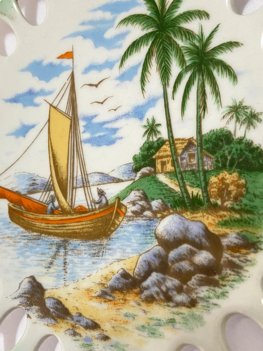 Prato antigo em porcelana Schmidt, com borda verde vazada e estampa decorativa de barco e coqueiros. Medida de 19,5cm de diâmetro.