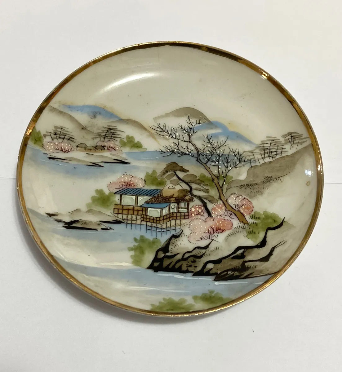 Prato decorativo japonês antigo, em porcelana, com pintura à mão representando uma paisagem com montanhas, flores de cerejeira e casa à beira d’água. Possui borda com detalhes dourados e acabamento esmaltado. No verso, apresenta carimbo de identificação do fabricante.