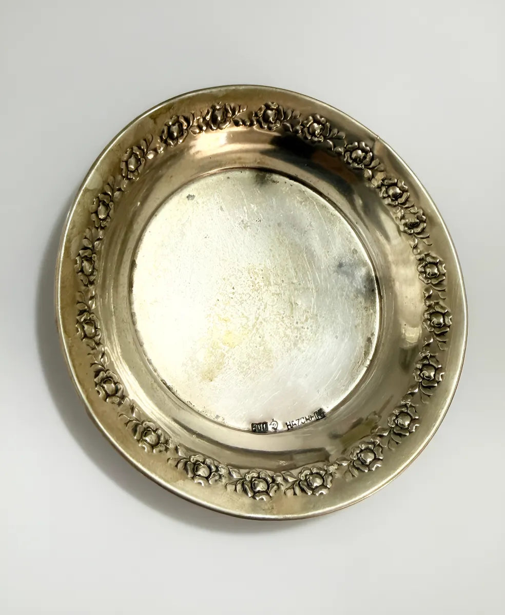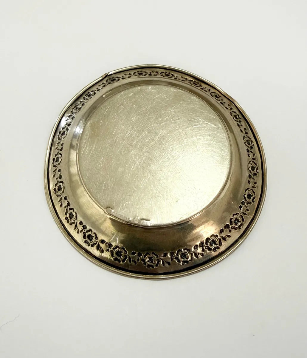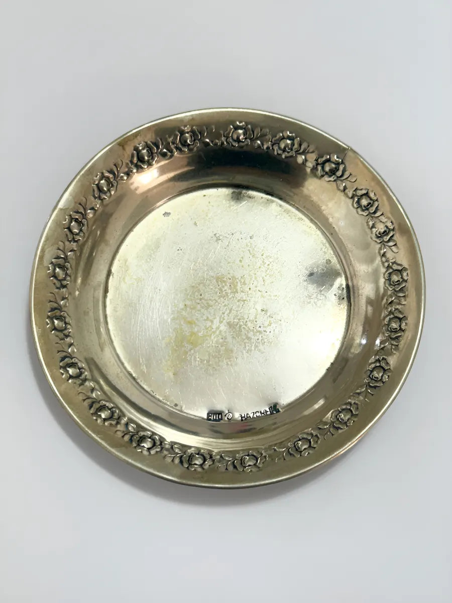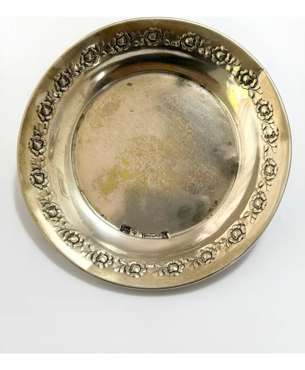 Pequeno prato antigo da renomada ourivesaria Hazorfim, produzido em prata 800 com borda delicadamente decorada com flores em relevo.