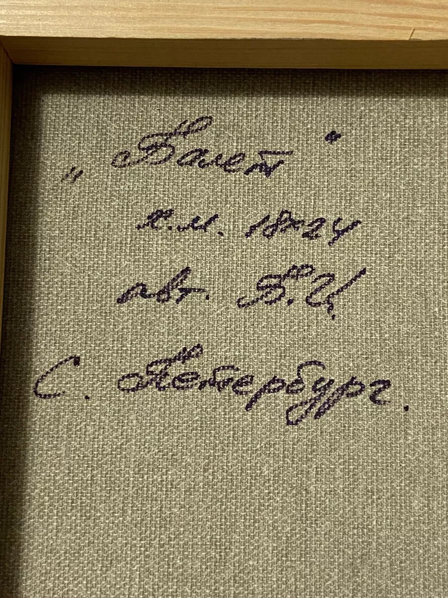 No verso da tela há uma inscrição em russo mencionando "Balé", "São Petersburgo" e a possível referência "1924". Isso pode indicar uma conexão com a tradição do balé russo, famoso por suas escolas e companhias icônicas.