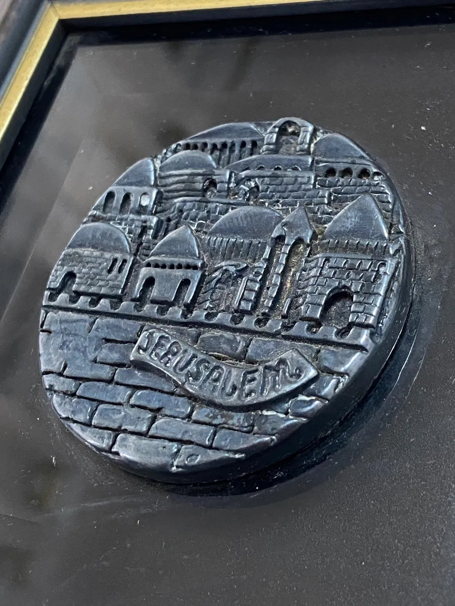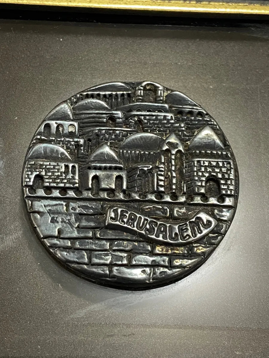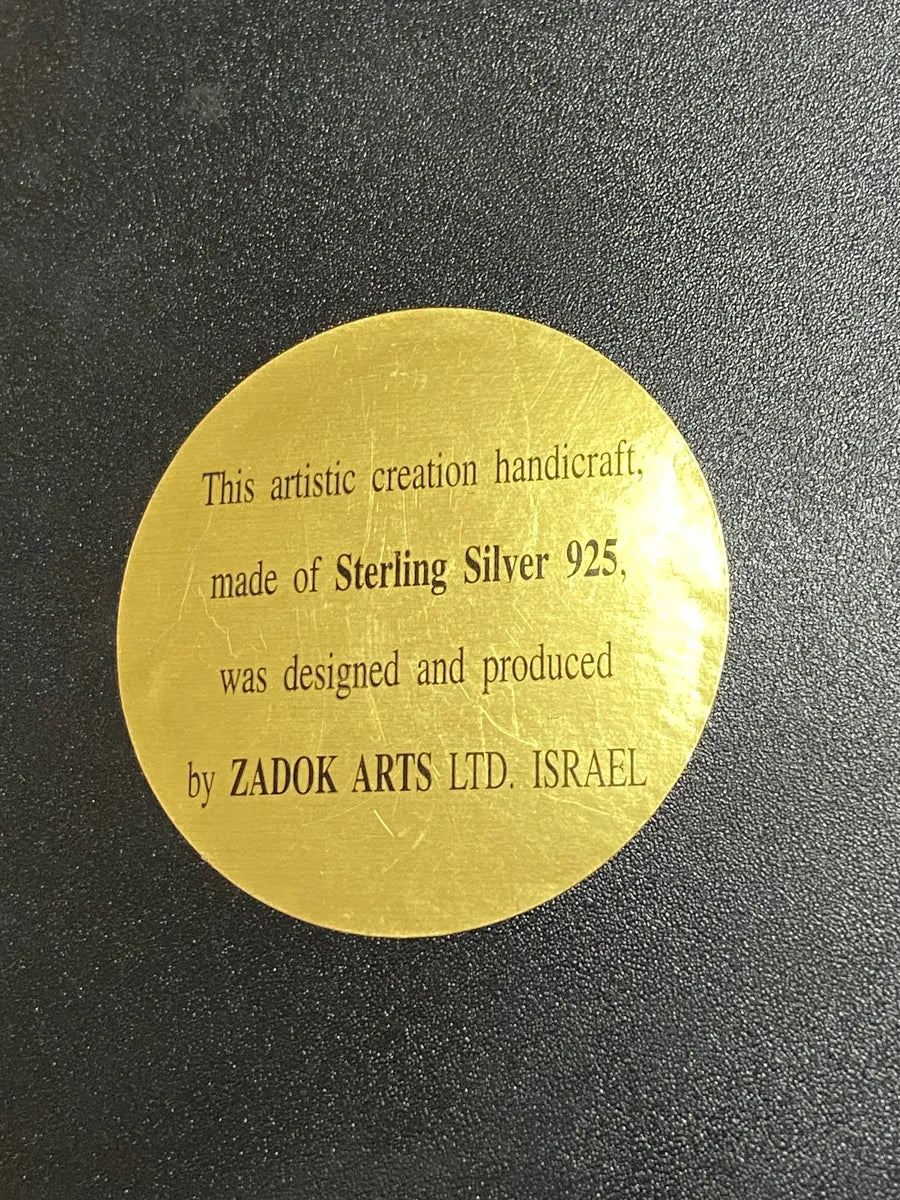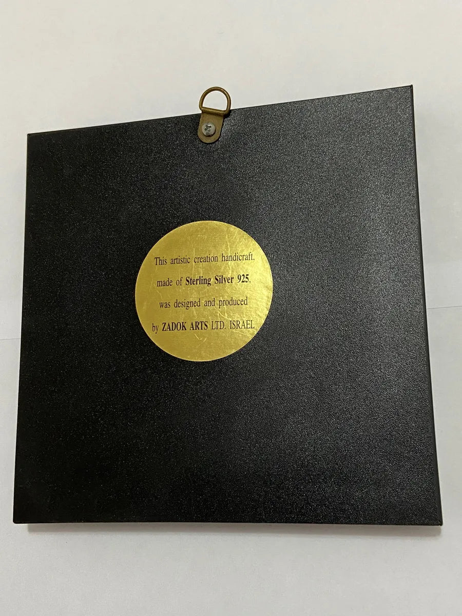 Peça artesanal exclusiva feita em Israel pela Zadok Arts Ltd., representando a cidade de Jerusalém em alto-relevo. O medalhão central é confeccionado em Prata Esterlina 925, conforme certificado na parte traseira.
